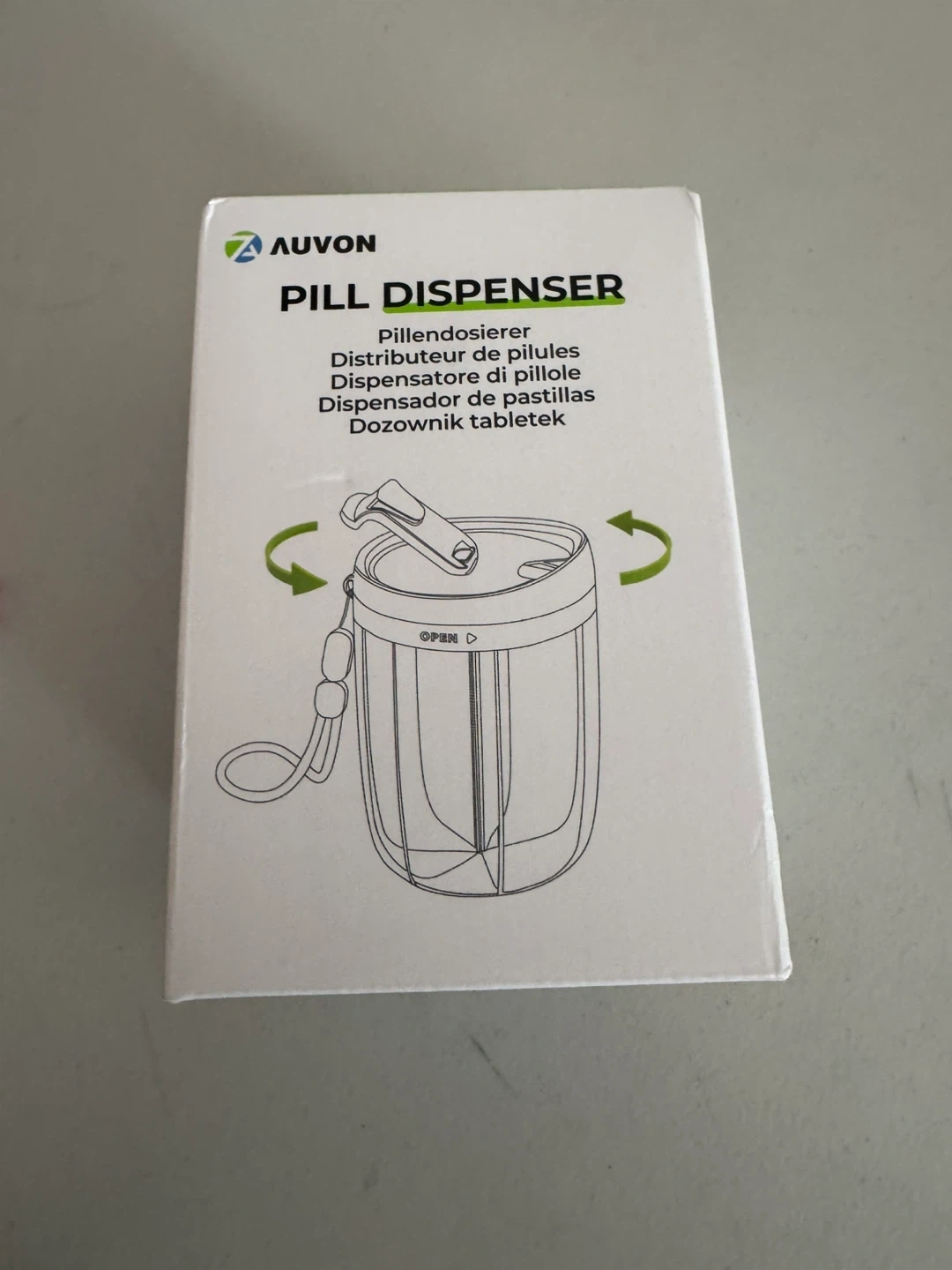 This AUVON pill dispenser is designed for convenience, featuring a built-in water bottle. It's perfect for keeping your medication and hydration together on the go. The dispenser includes a strap for easy carrying and a small pouch.
