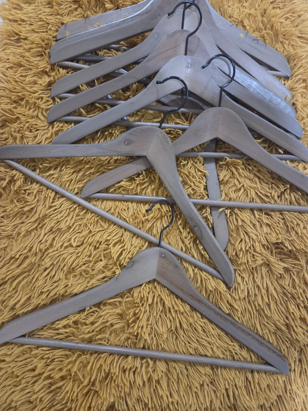 A set of 80 grey wooden hangers with black metal hooks. These hangers are sturdy and great for organizing your closet. They're made of wood.