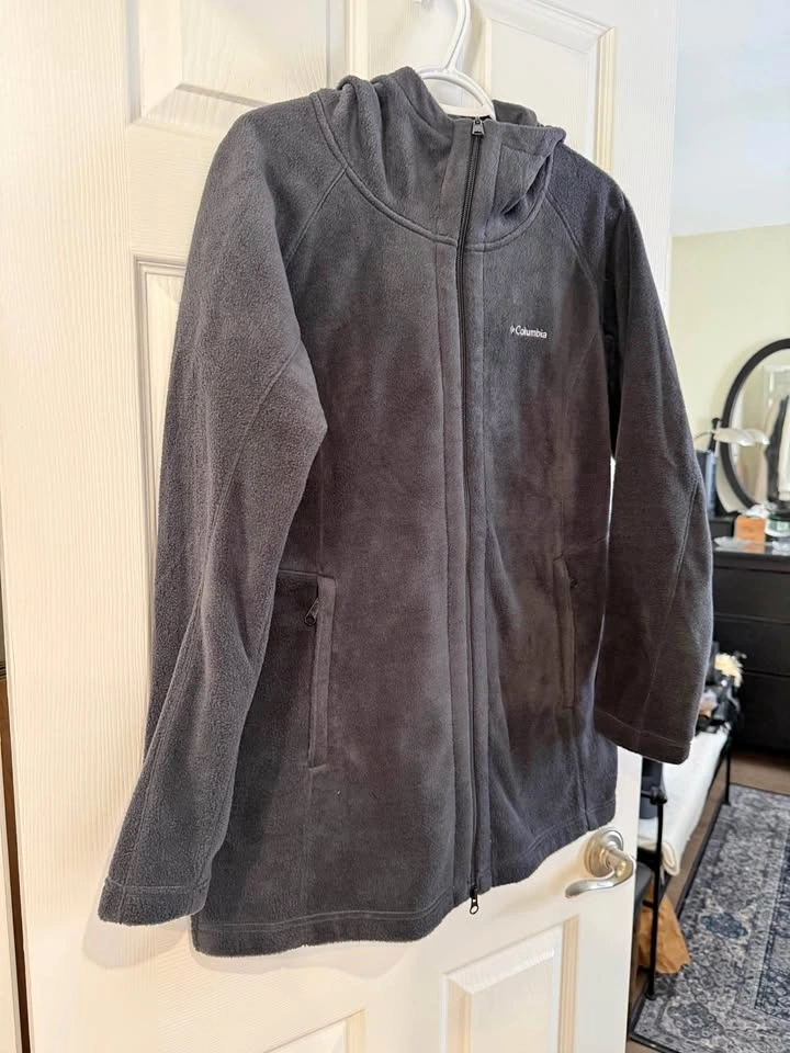 Warm Columbia fleece jacket. Has a hood and full zip. Dark black color. Side pockets with zippers too. Super comfy. Size is large. Worn 2 times. Almost new.