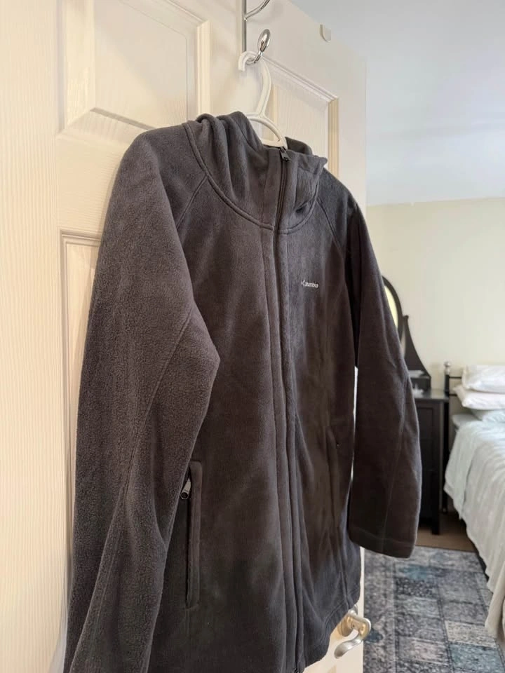 Warm Columbia fleece jacket. Has a hood and full zip. Dark black color. Side pockets with zippers too. Super comfy. Size is large. Worn 2 times. Almost new.