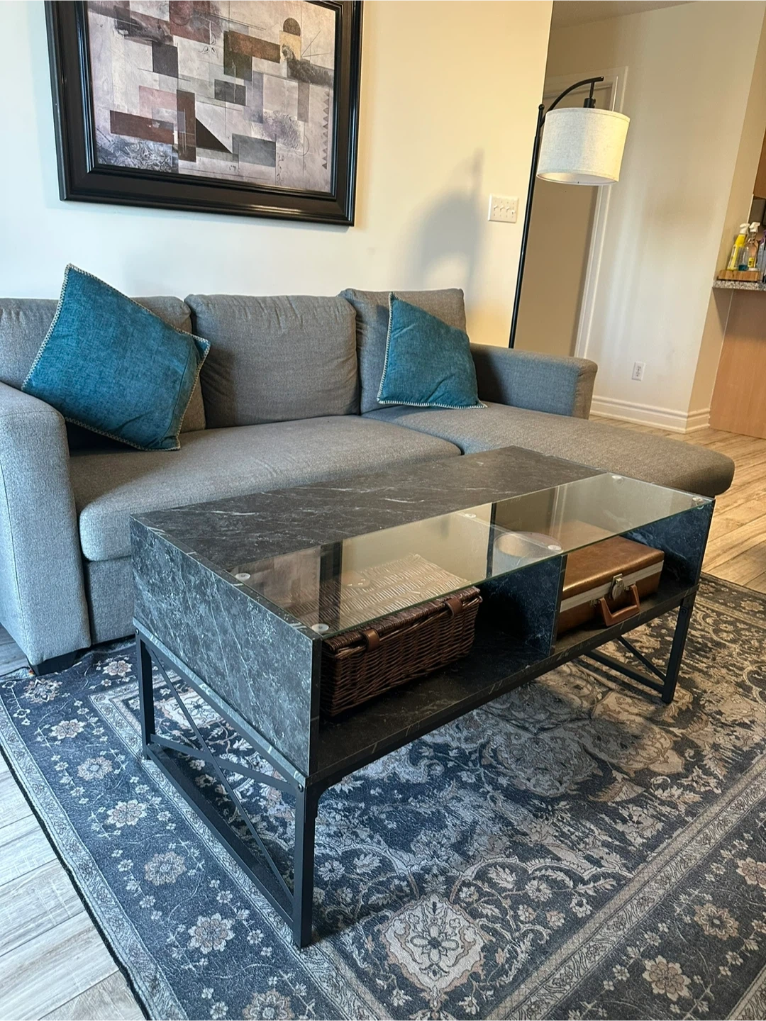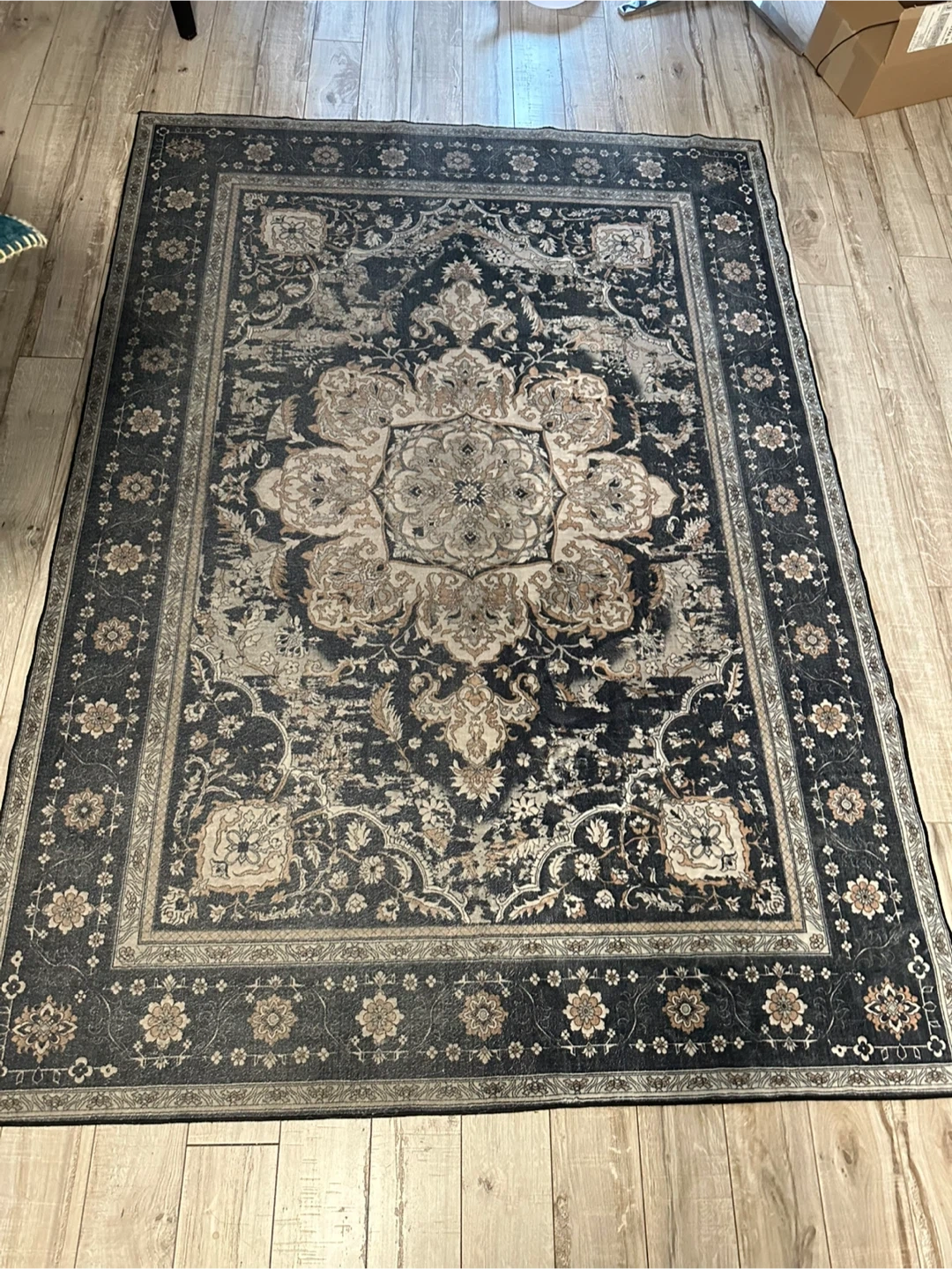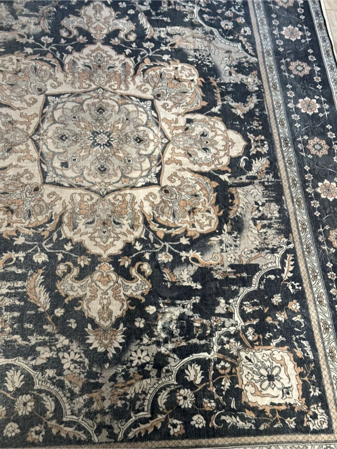 This large area rug features a distressed vintage pattern in dark blue and beige tones. It's made from a durable synthetic material, perfect for high-traffic areas. Add a touch of classic elegance to your living space!