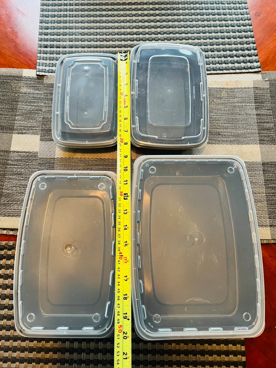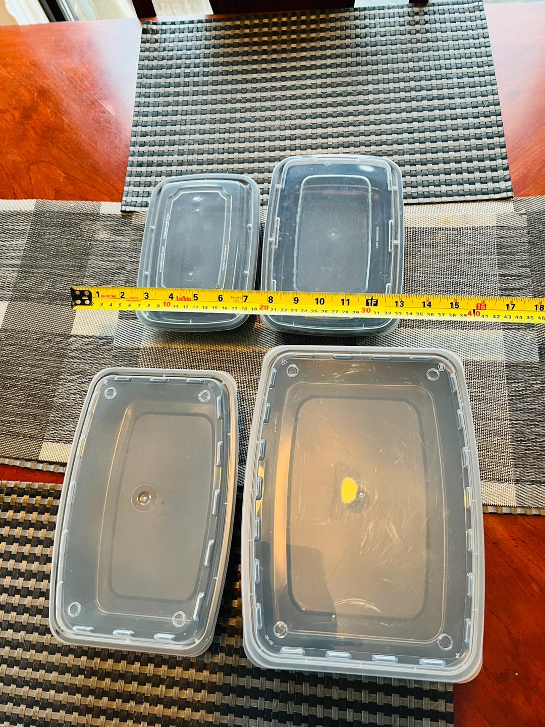 Different sizes (measurements in pictures). Microwave / dishwasher safe. Ideal for meal preps, catering, take-out / leftover meals, lunches, summer picnics, etc… AND perfect to store nick-nacks, art supplies, small toys (Lego). Great condition and excellent for organization! All containers have been sanitized in the dishwasher.