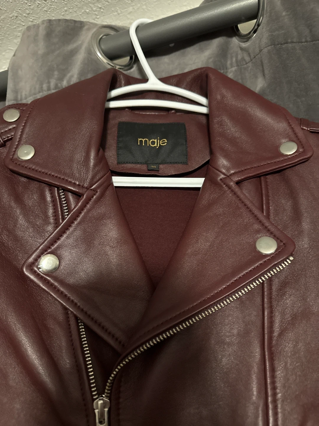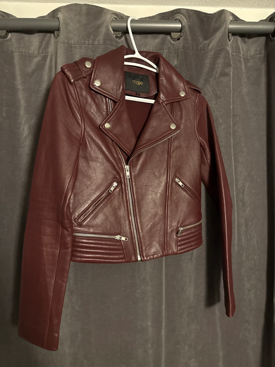 Maje leather biker jacket in a rich burgundy colour. It's a size 36. This jacket has classic biker detailing. It's perfect for adding a stylish edge to any outfit!