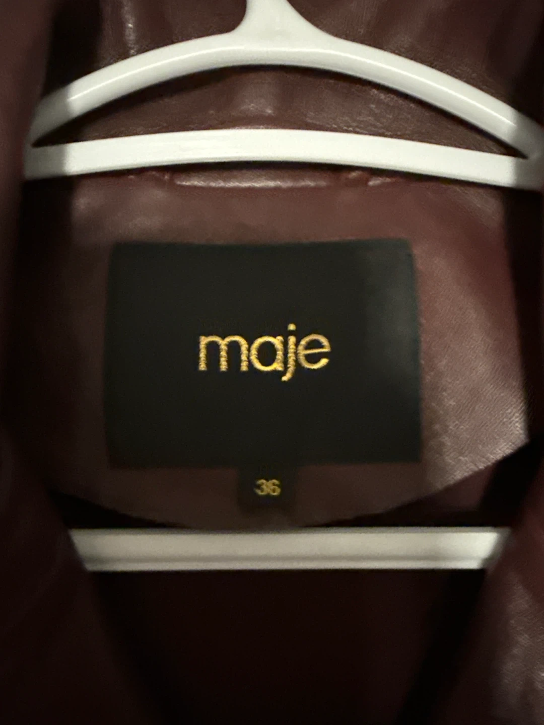 Maje leather biker jacket in a rich burgundy colour. It's a size 36. This jacket has classic biker detailing. It's perfect for adding a stylish edge to any outfit!