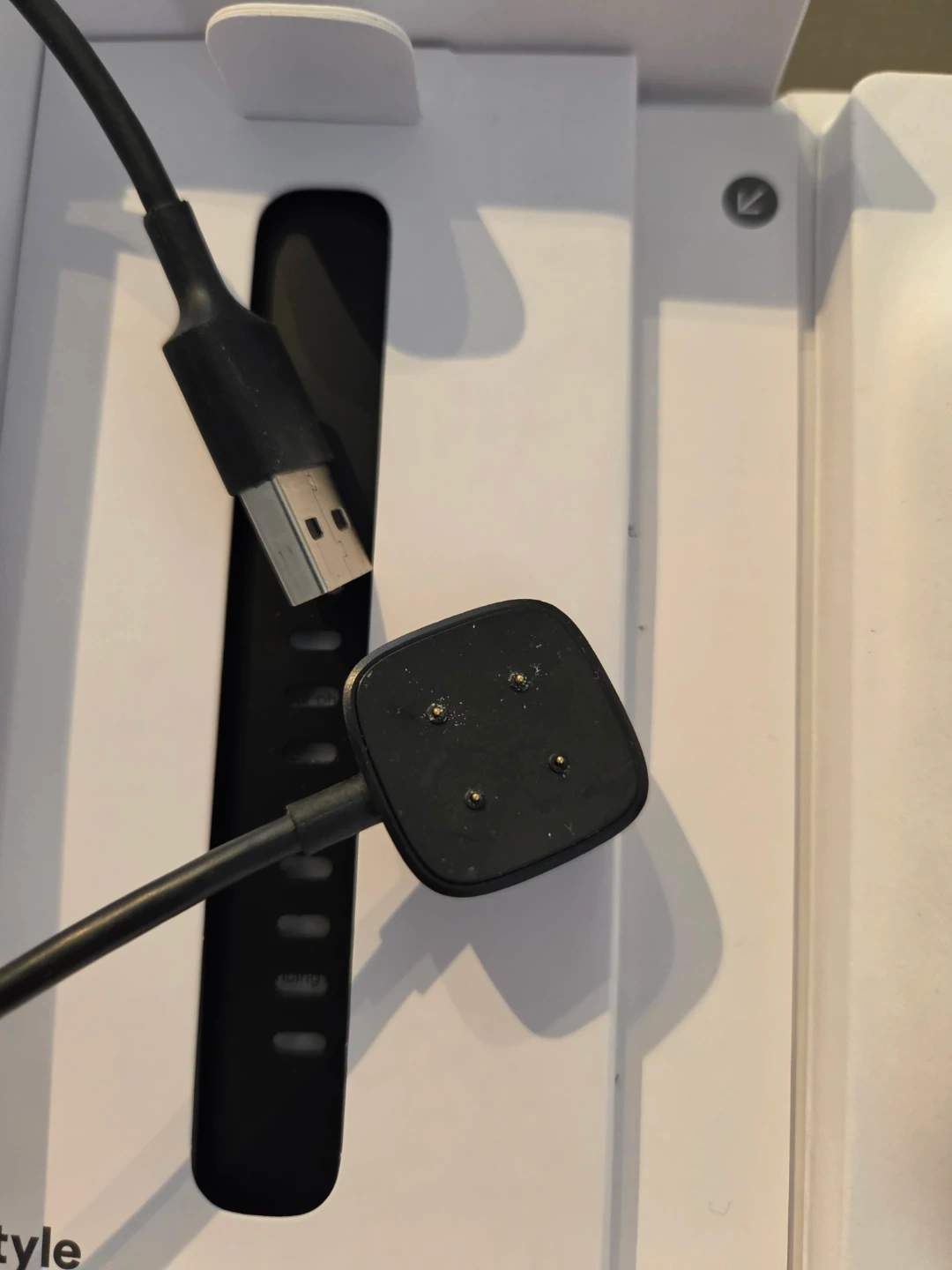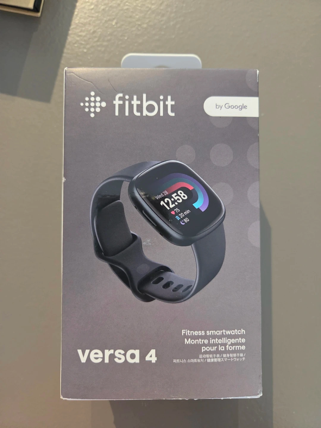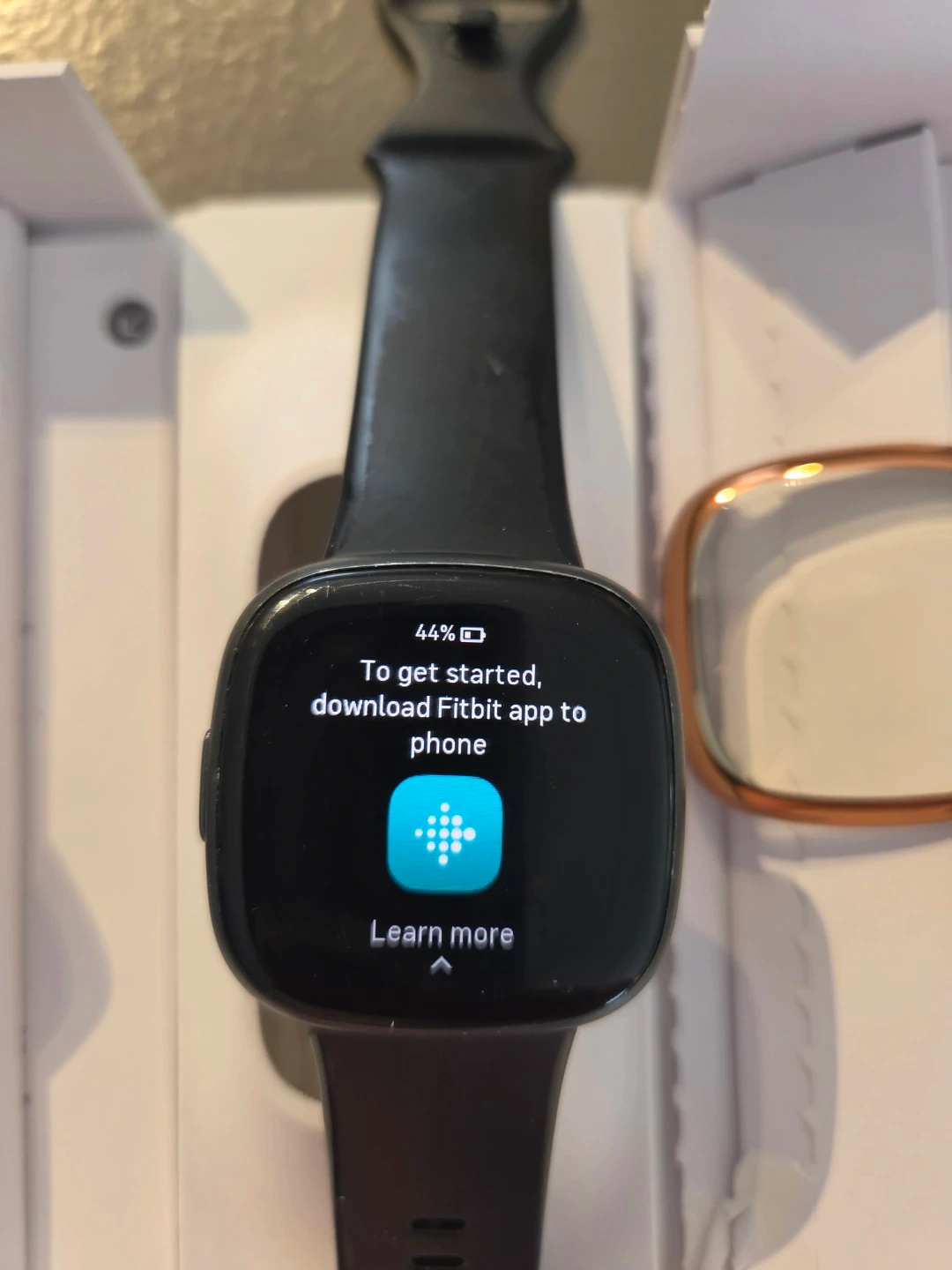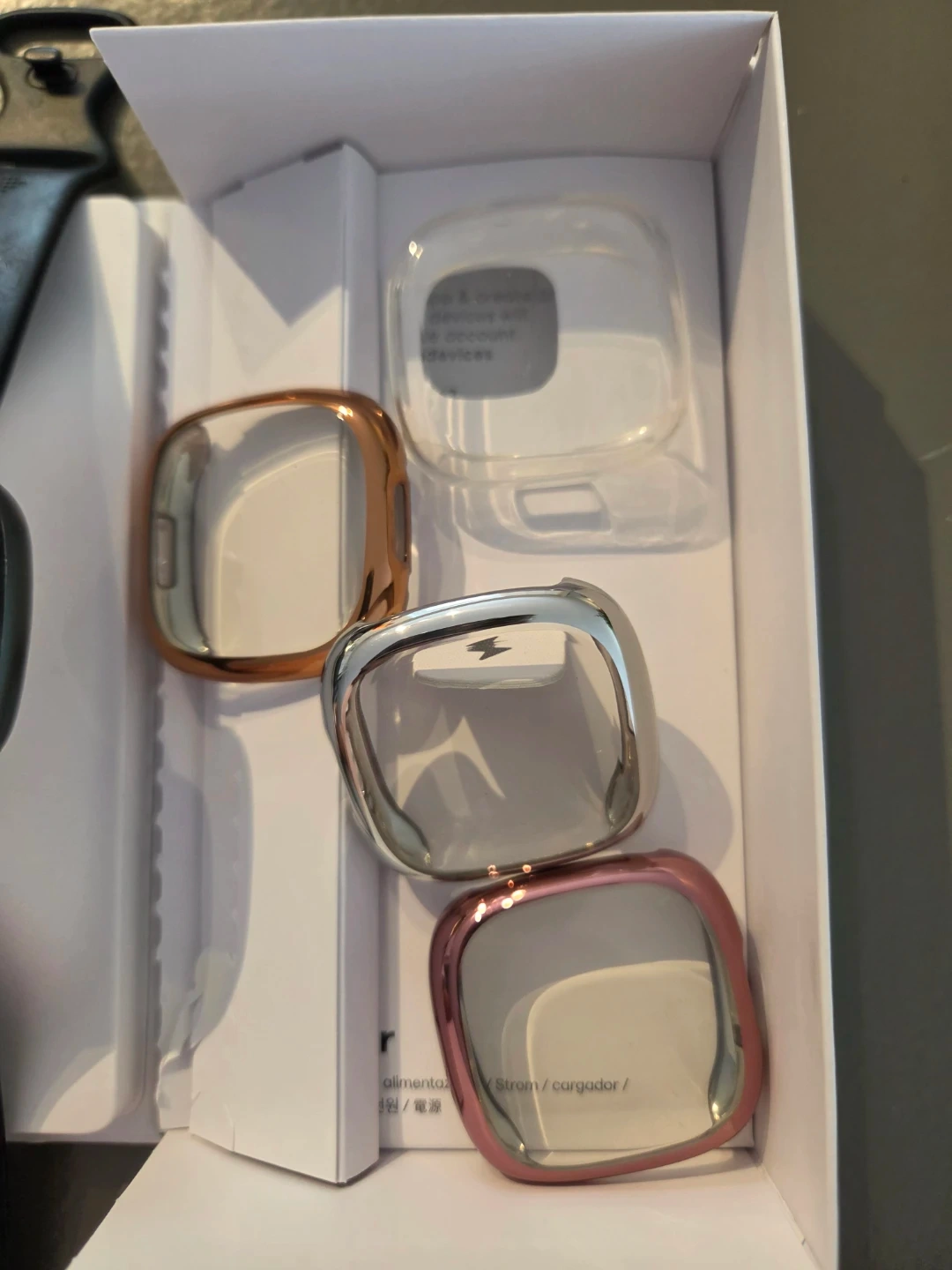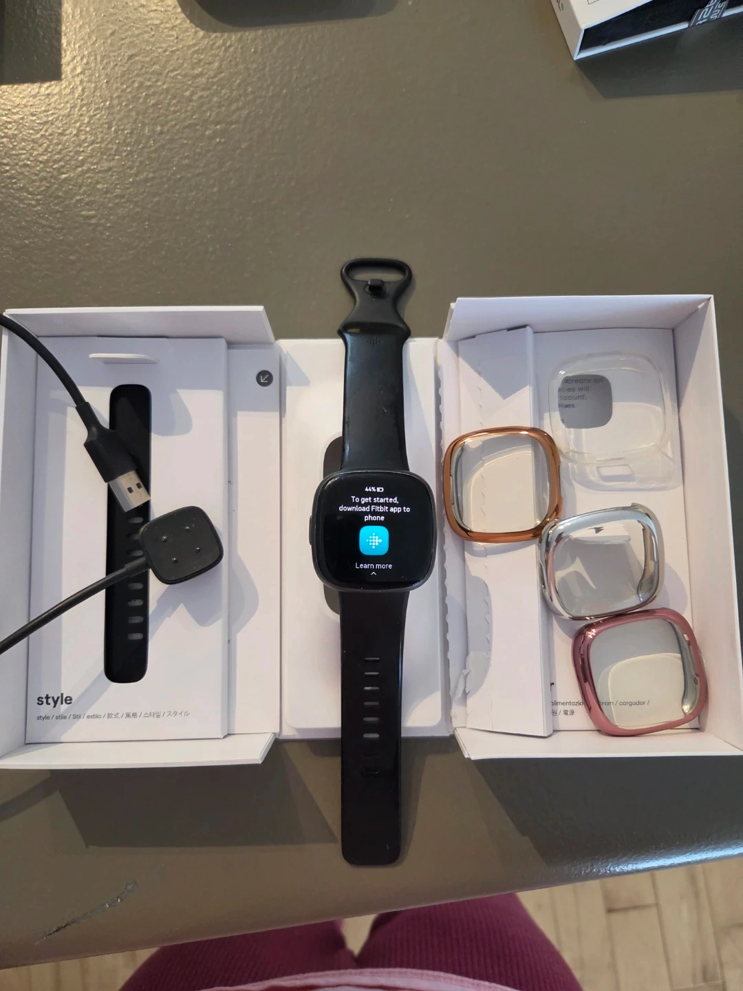 This is a Fitbit Versa 4 fitness smartwatch. It comes with a charging cable and three interchangeable watch bezels in rose gold, silver, and clear colours. The device is ready to set up with the Fitbit app.🥕