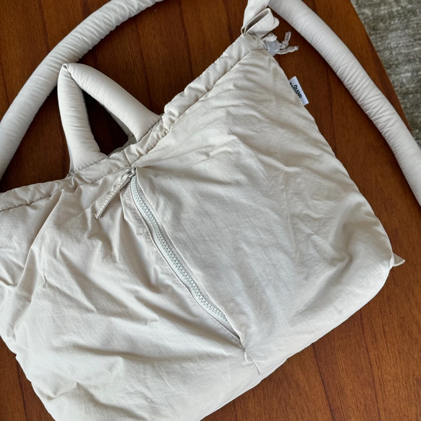 Ölend Ona bag in color sand. Soft, versatile and compatible with laptops up to 17". Water-resistant light nylon & convertible straps.