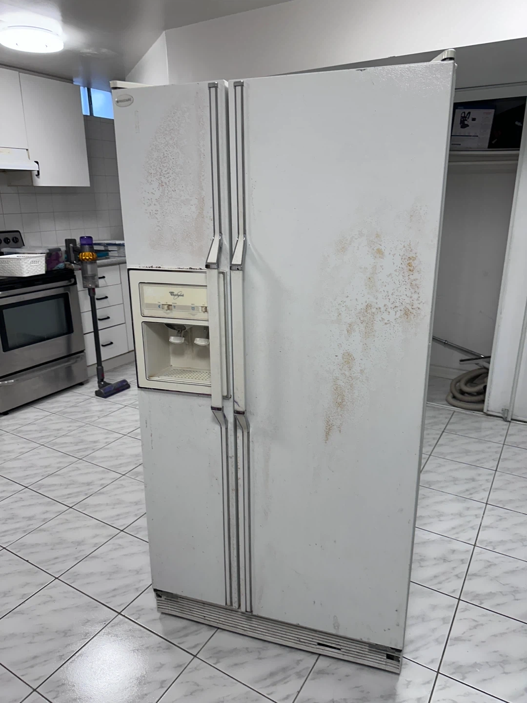 Whirlpool side-by-side refrigerator. Features an ice and water dispenser. White finish. It's a working unit.