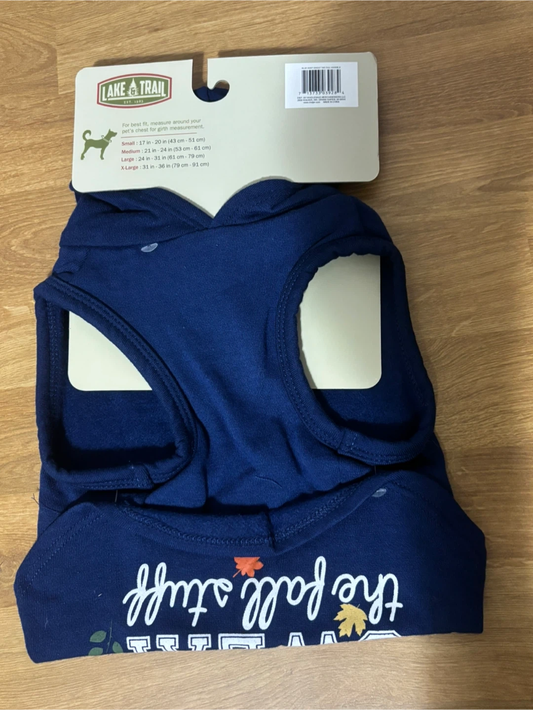 Keep your furry friend cozy with this adorable Lake & Trail dog hoodie! It's a size small, perfect for a chest girth of 17-20 inches (43-51 cm). The hoodie is a navy blue and color.