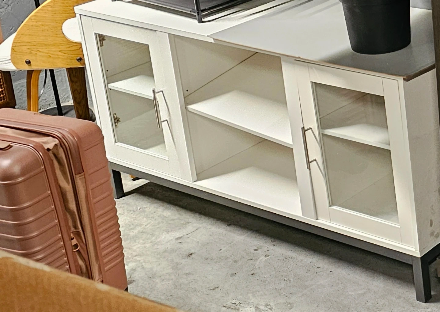 This white TV stand features glass cabinet doors and open shelving. It's ideal for storing media consoles or displaying decor. It has a modern design with sleek silver handles.