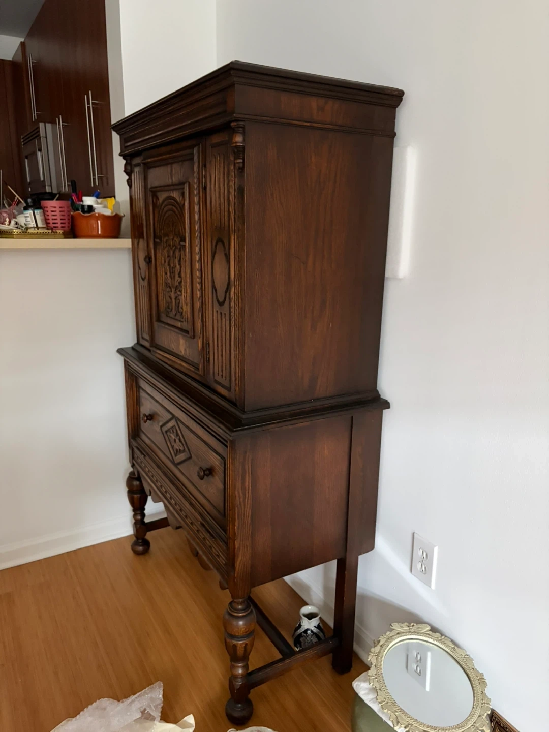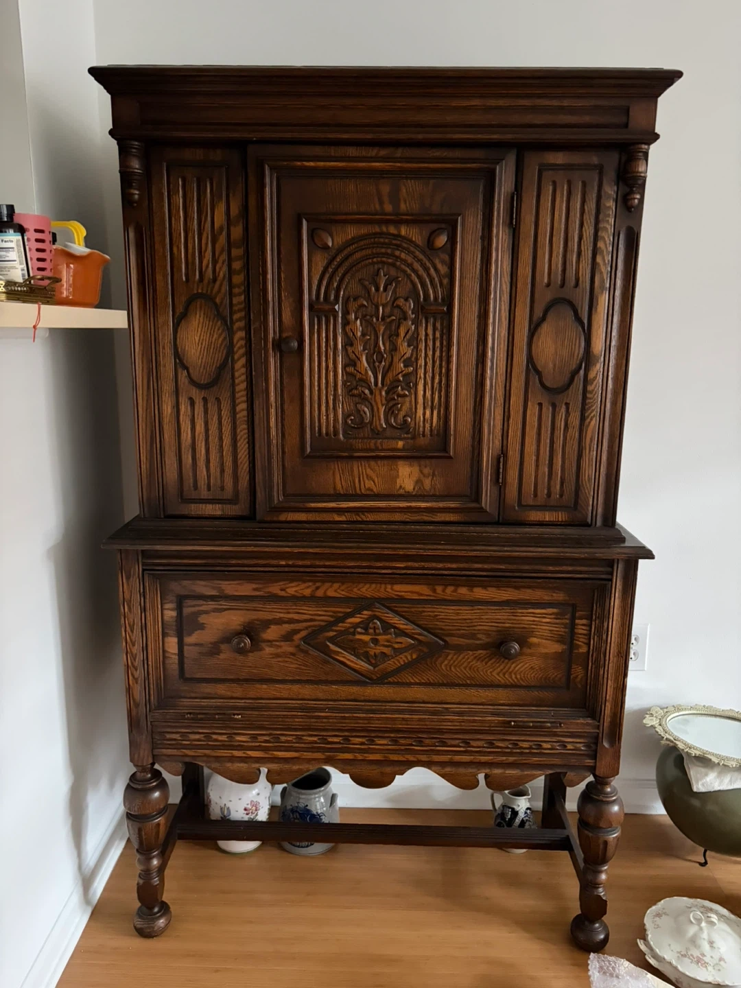 This is a beautiful antique china cabinet made of dark oak. It features carved detailing on the doors and a single drawer with two knobs. The cabinet stands on carved legs, offering storage and display space.