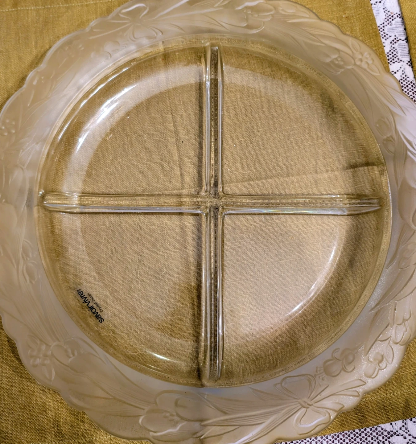 This clear glass serving platter features a decorative floral and ribbon embossed edge. It has four divided sections, perfect for serving appetizers or snacks. It's made of durable glass.