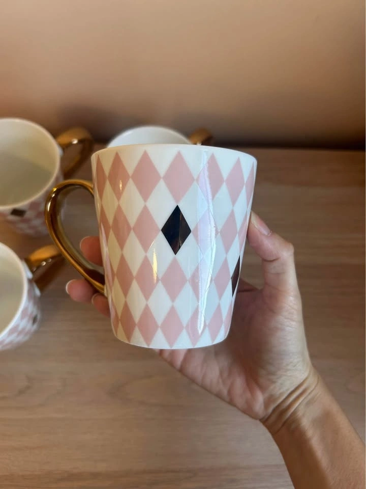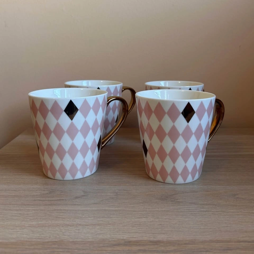 Four beautiful mugs which add a touch of class and elegance to your home. These are the Maxwell & Williams Aurora Diamond Mug with a gold handle and a pink harlequin/argyle pattern.