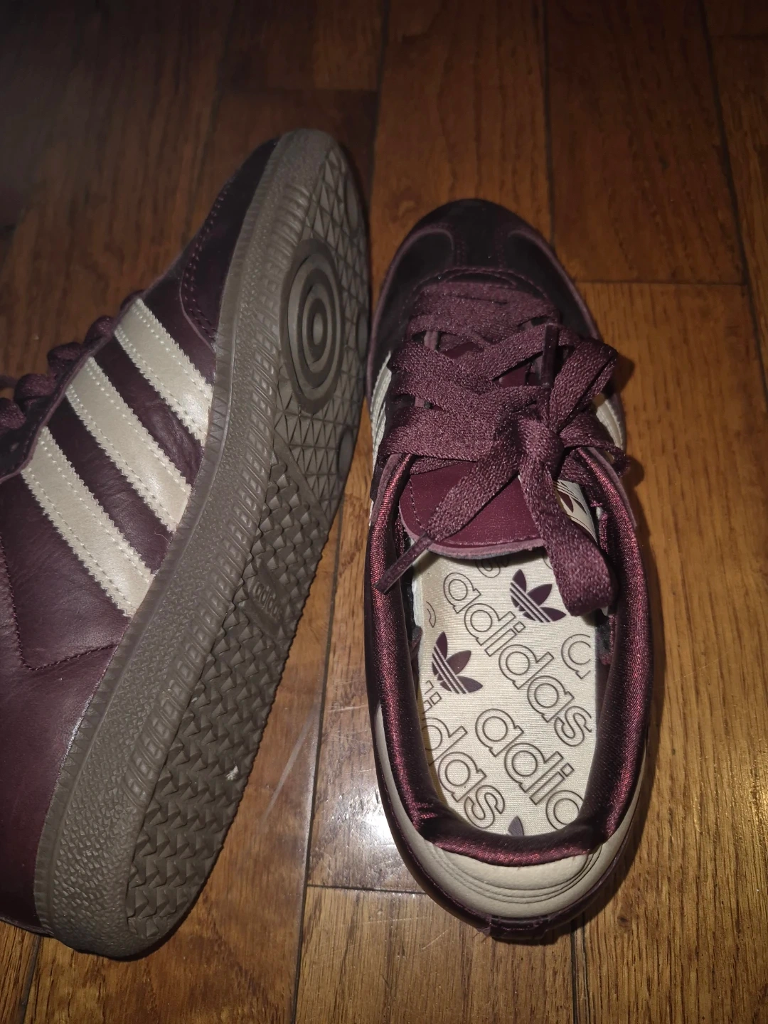 Classic Adidas Samba sneakers in a deep burgundy color with white stripes. These iconic shoes feature a durable construction and comfortable fit. Great for casual wear or athletic activities!