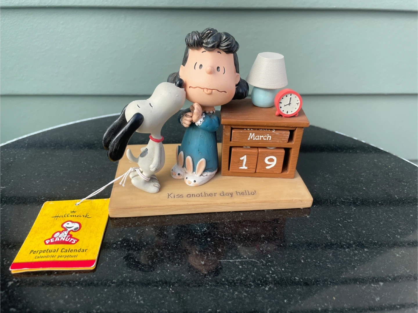Cute Hallmark Peanuts perpetual calendar figurine featuring Lucy and Snoopy. The calendar is set to March 19 and has the phrase "Kiss another day hello!" inscribed. Made of resin, it's a great decorative piece for any Peanuts fan's desk or shelf.