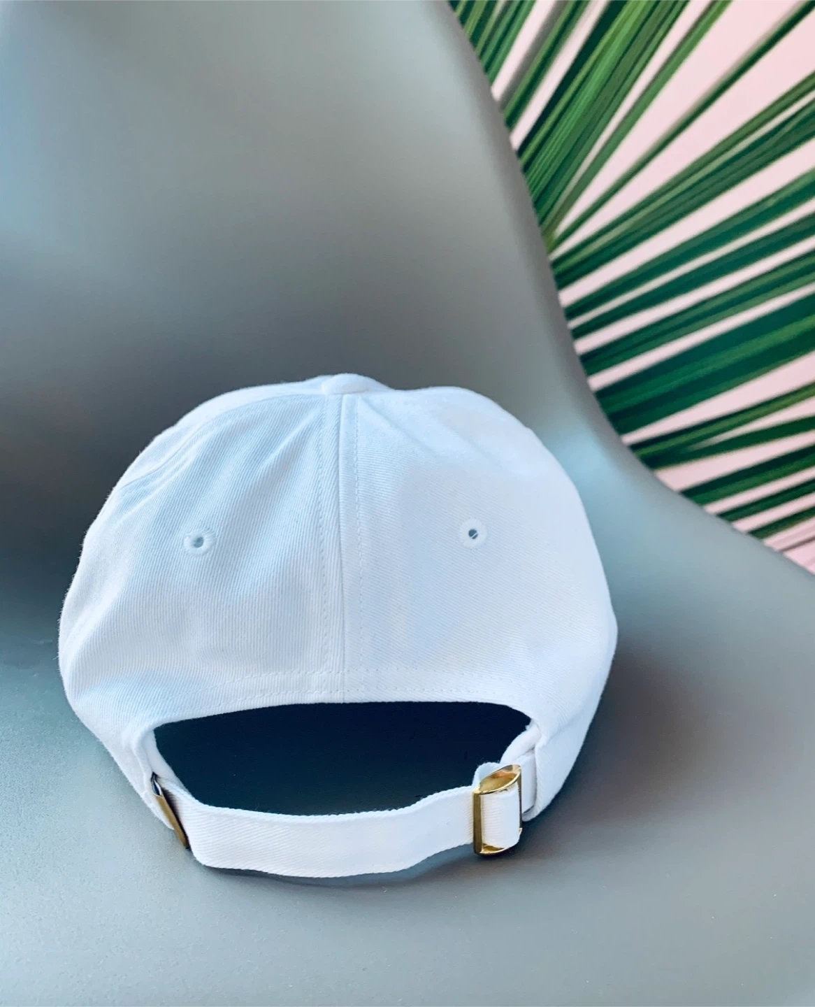 White baseball cap featuring the OVO owl logo. Adjustable strap with gold buckle closure. Cotton twill material.
