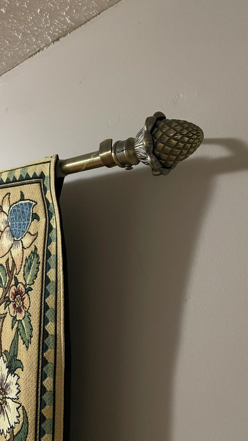 Crafted with detailed jacquard weaving, it showcases a lush tree with white blossoms and green foliage against a deep navy blue background, surrounded by a decorative border of pomegranates, flowers, and scrolling vines in warm cream and earthy tones. The tapestry is in excellent pre-owned condition, with no visible tears, stains, or fading. It comes ready to hang with a metal rod and decorative pineapple finials (as shown in the photos), making it easy to display immediately.
