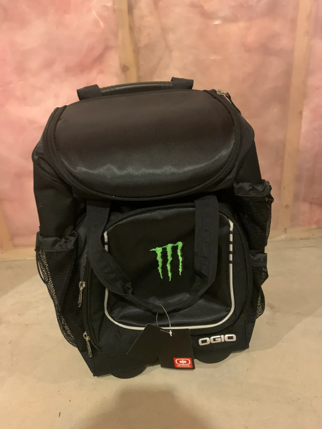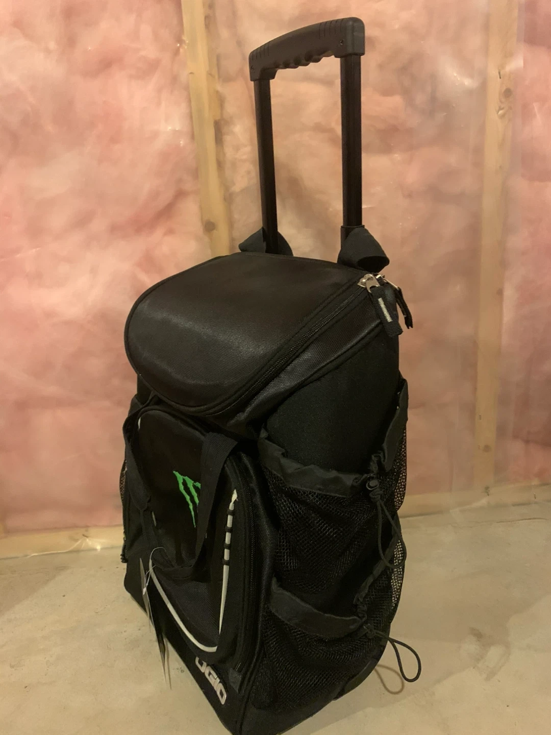 This black OGIO rolling backpack features the Monster Energy logo. It has a retractable handle and wheels for easy transport. Plenty of pockets for storage! Great for camping, outdoor/ indoor sports!