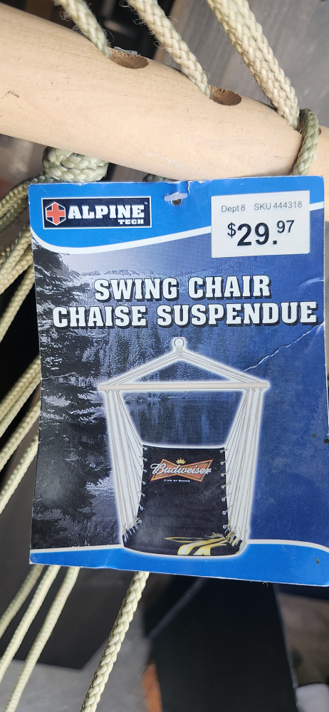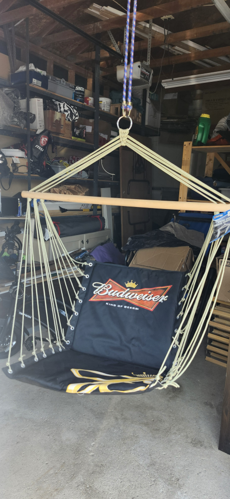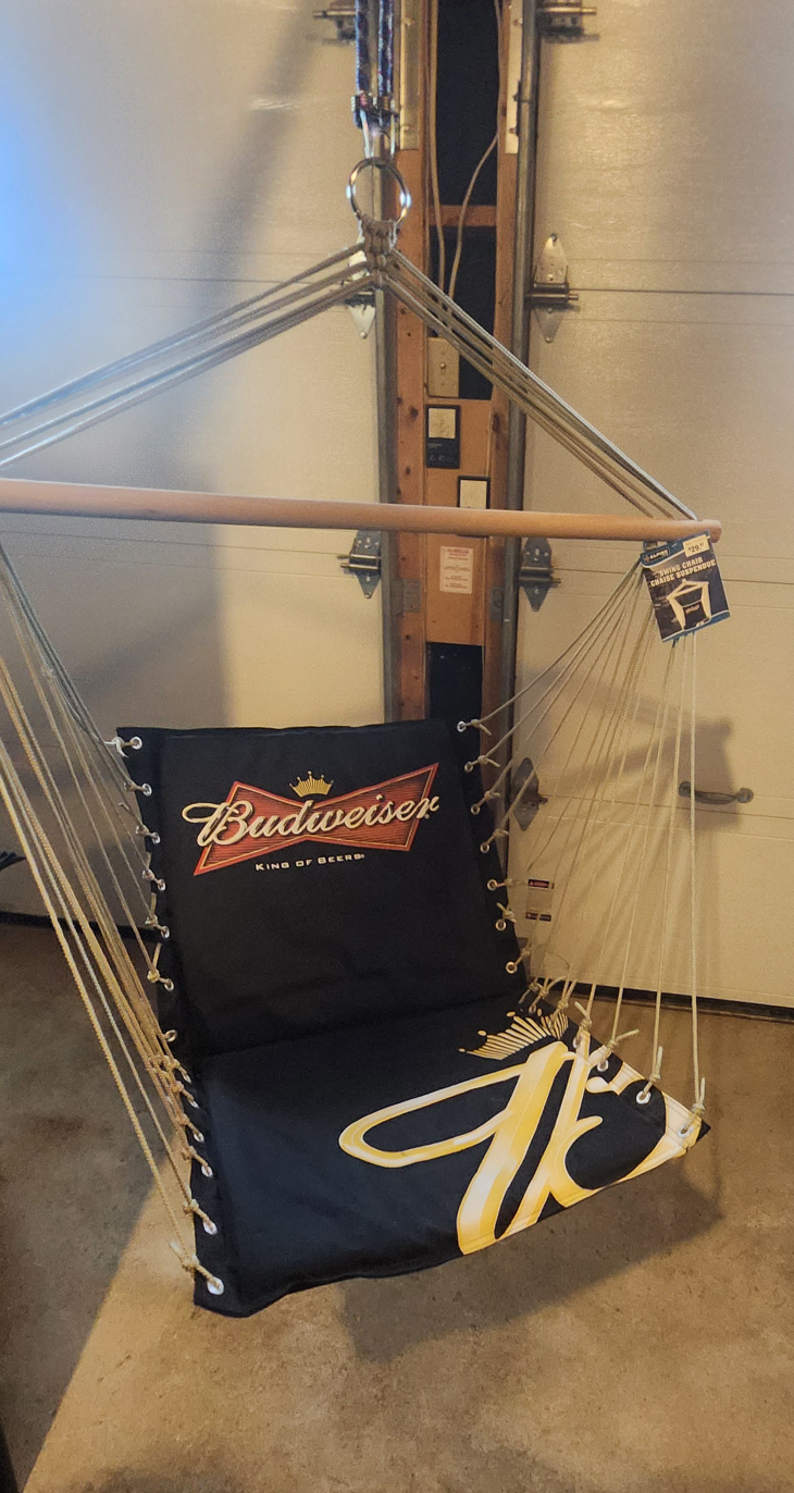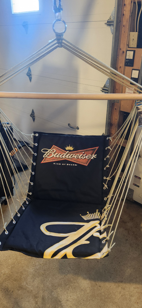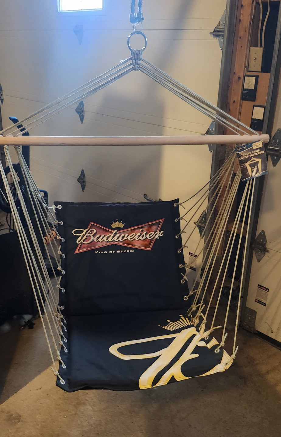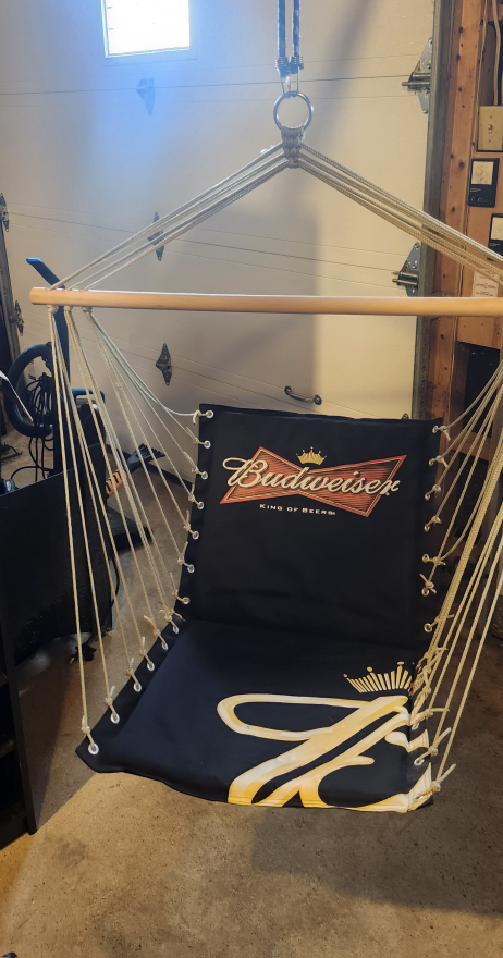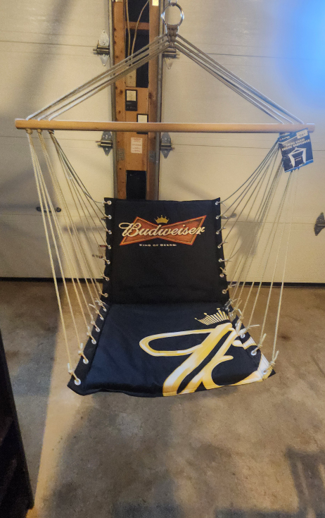 Swing into relaxation with this Budweiser swing chair! It features the iconic Budweiser logo. The tag shows it was originally $29.97. Perfect for adding a touch of fun to your space