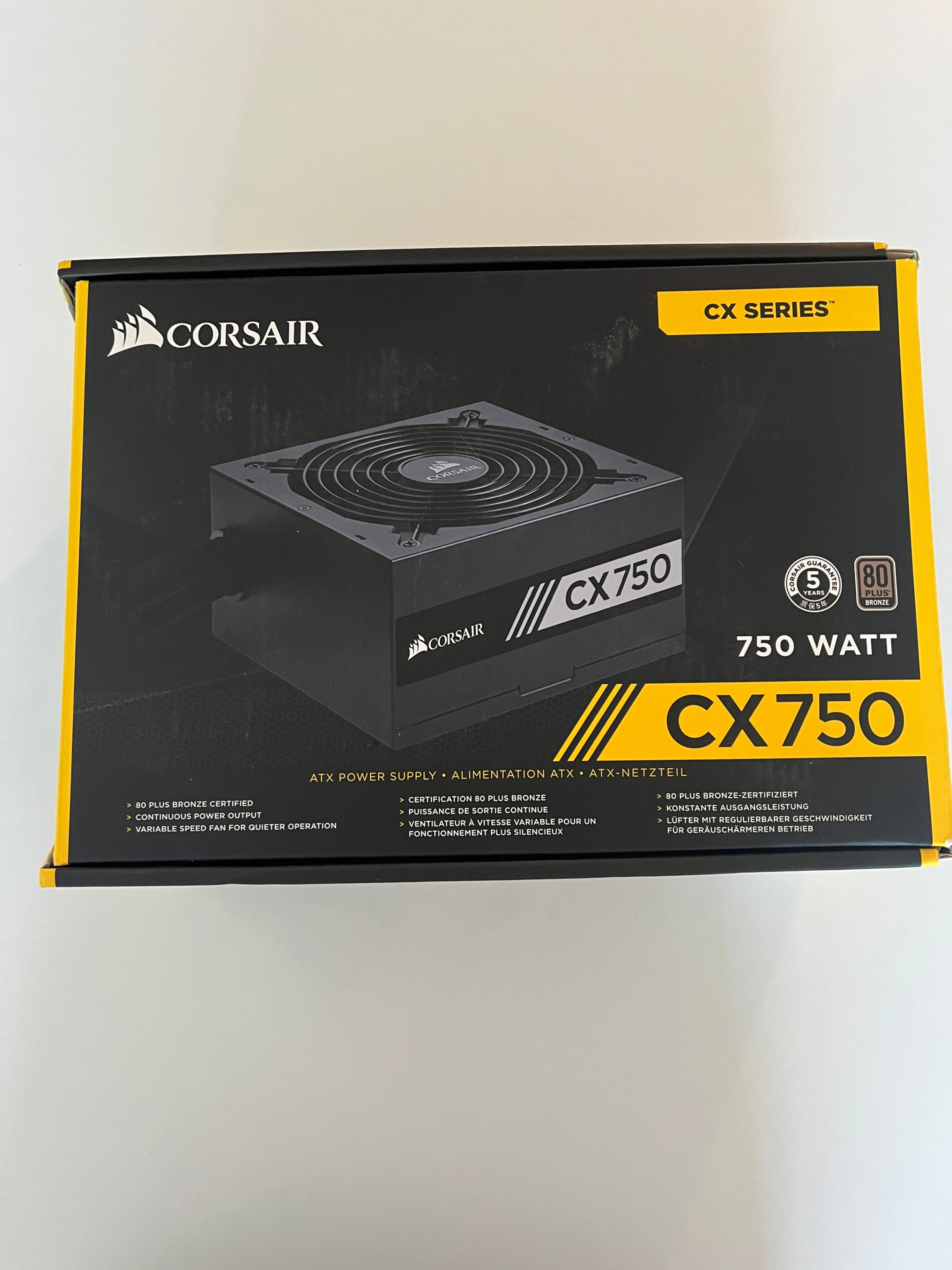 Corsair CX750 750W power supply. Used, in good working condition. 80 Plus Bronze certified, semi-modular design, 750W continuous power output. Reliable PSU for a mid-range gaming build. $53 CAD.