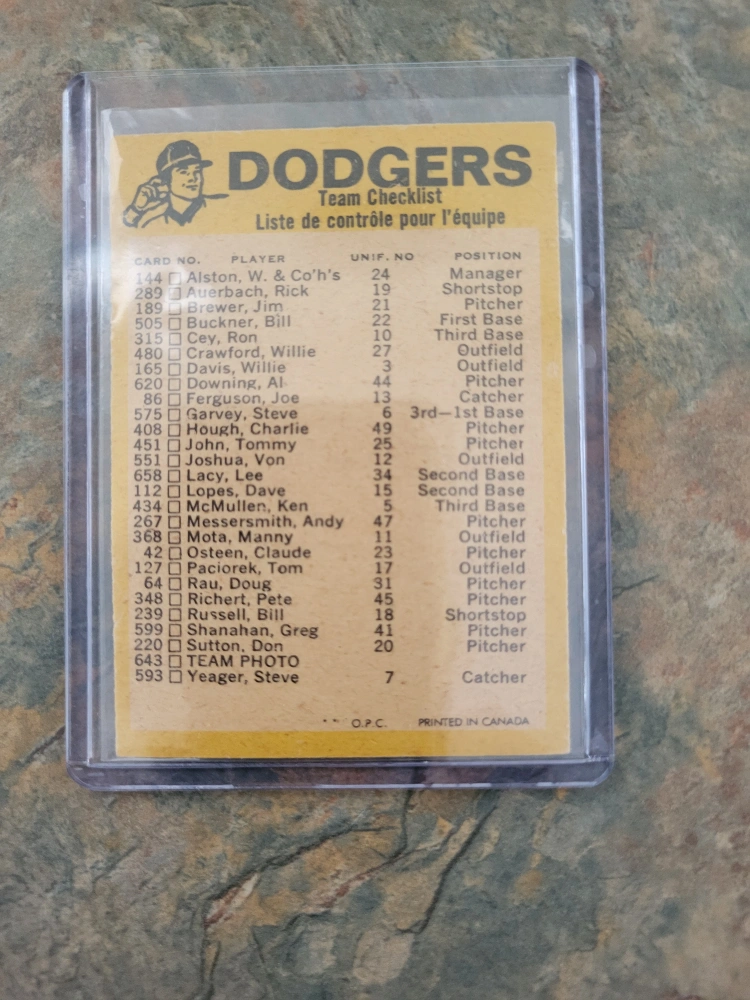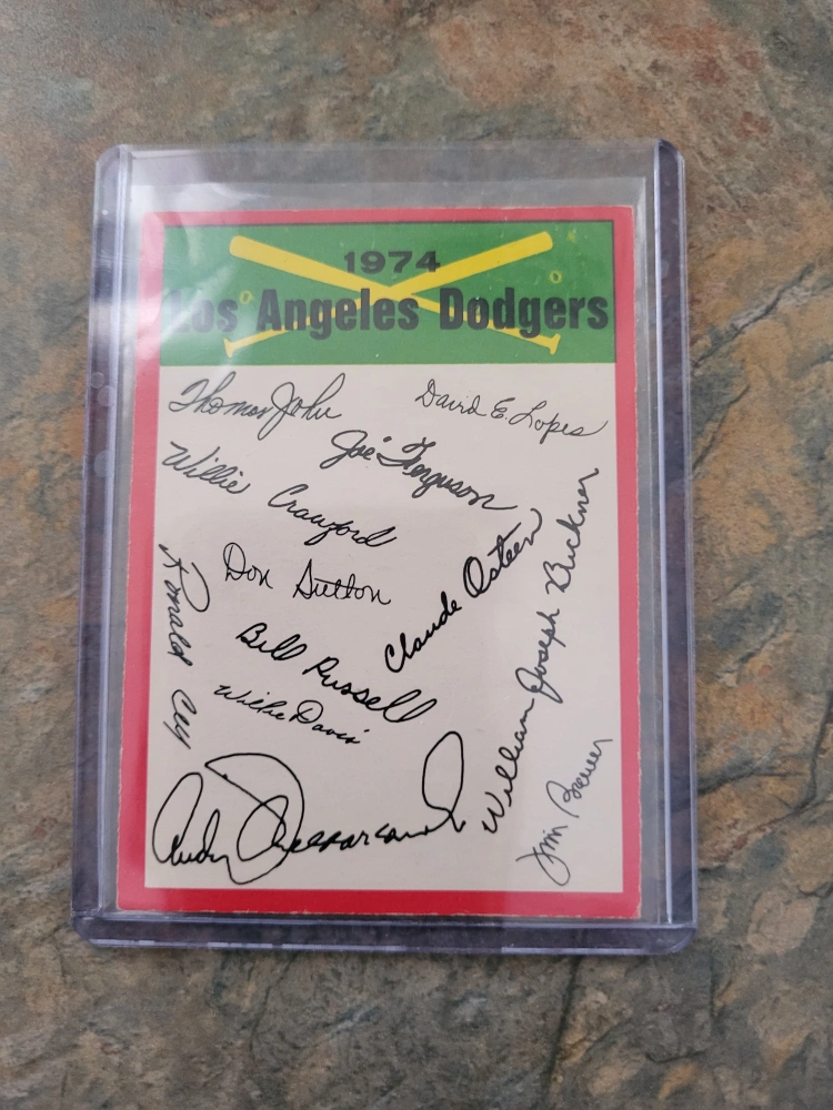 This is a 1974 Los Angeles Dodgers team checklist card. It features the team roster and signatures from several players.