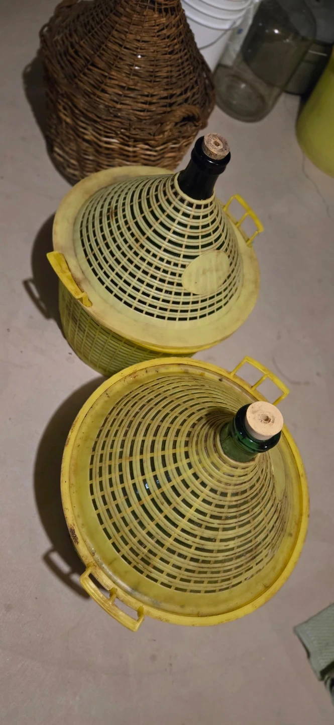 This is a large glass demijohn bottle, one with its original wicker casing and another with a protective yellow plastic casing. Both have cork stoppers.
