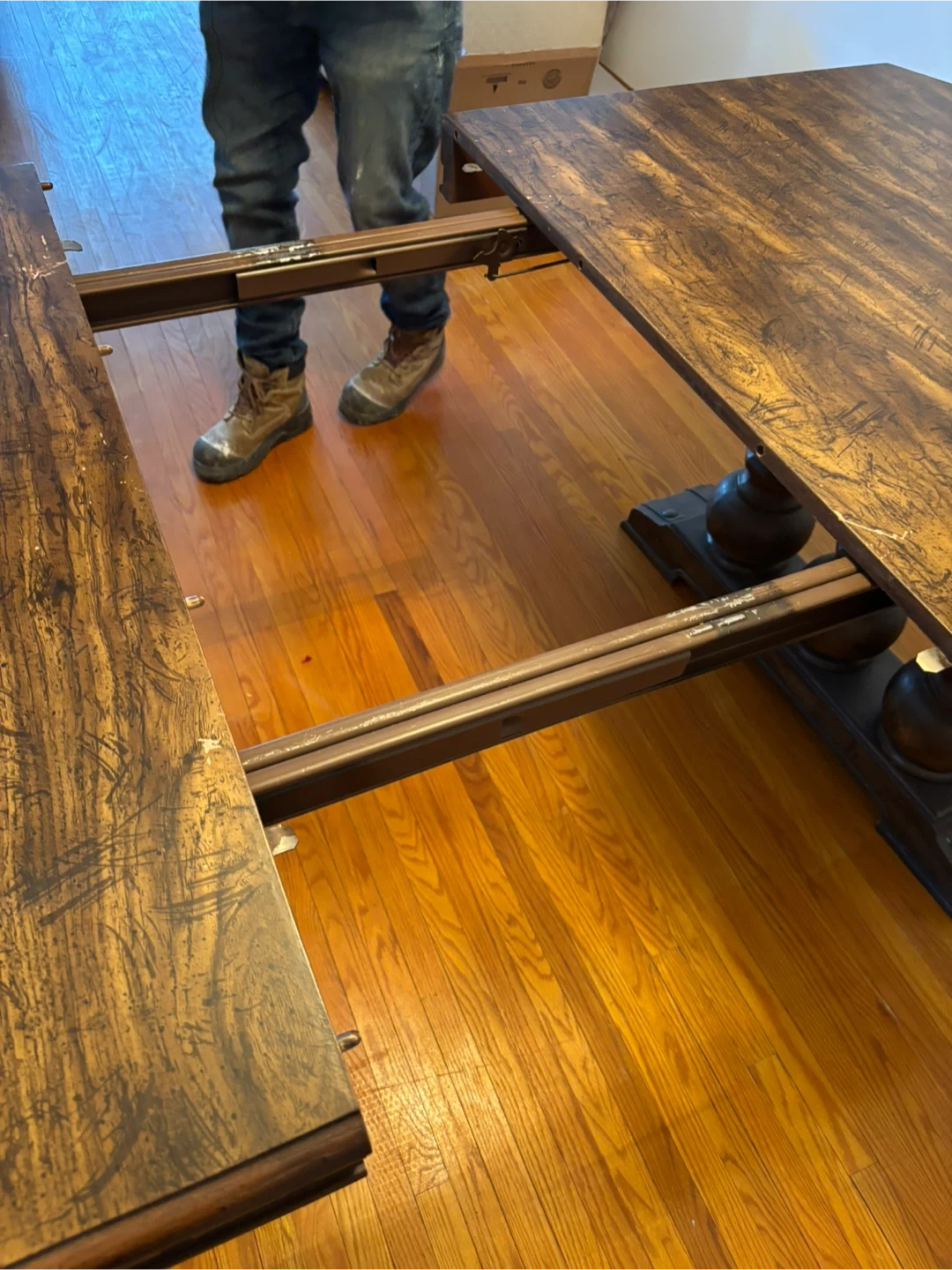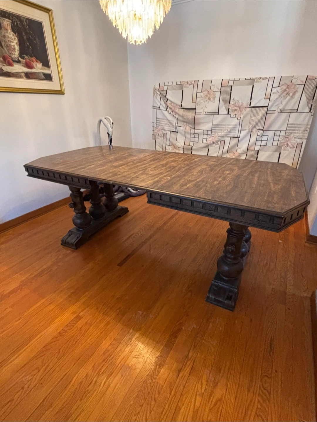 This vintage dark wood dining table extends to accommodate more guests. It features ornate carved pedestal legs for a classic look. Great for hosting family dinners or larger gatherings!