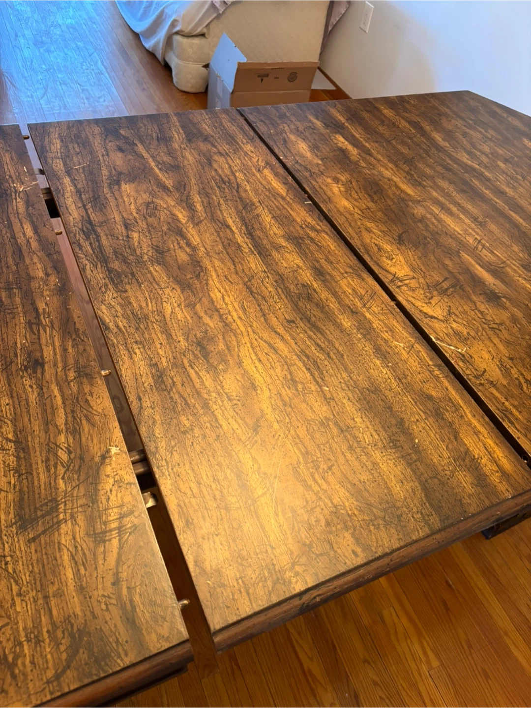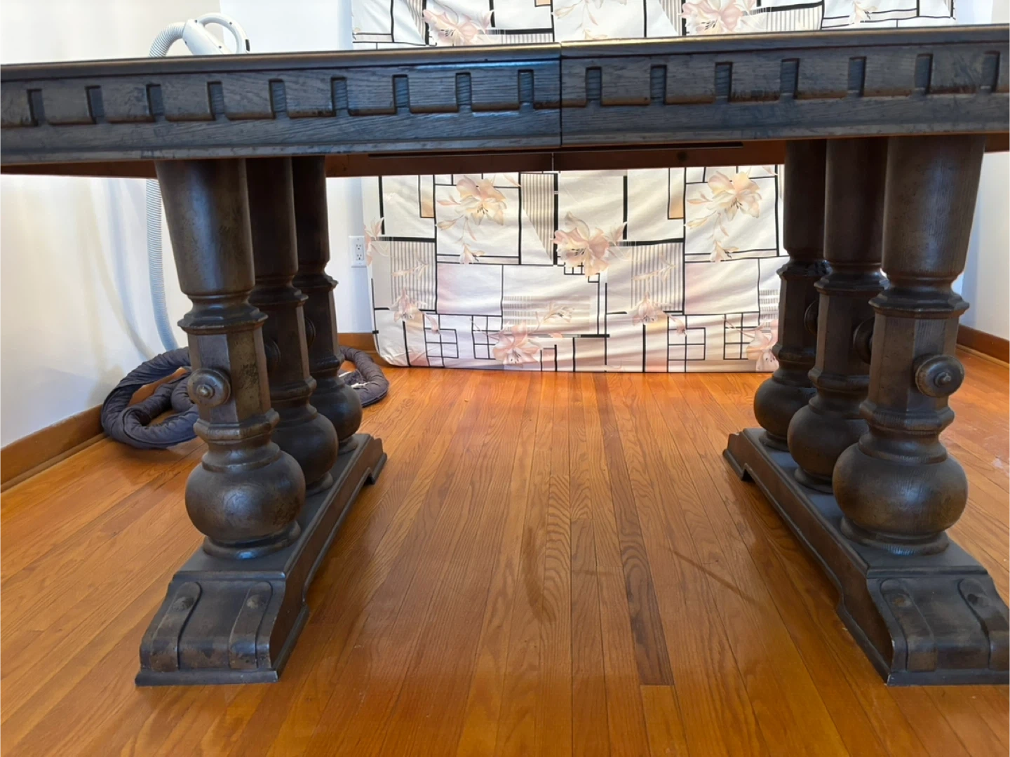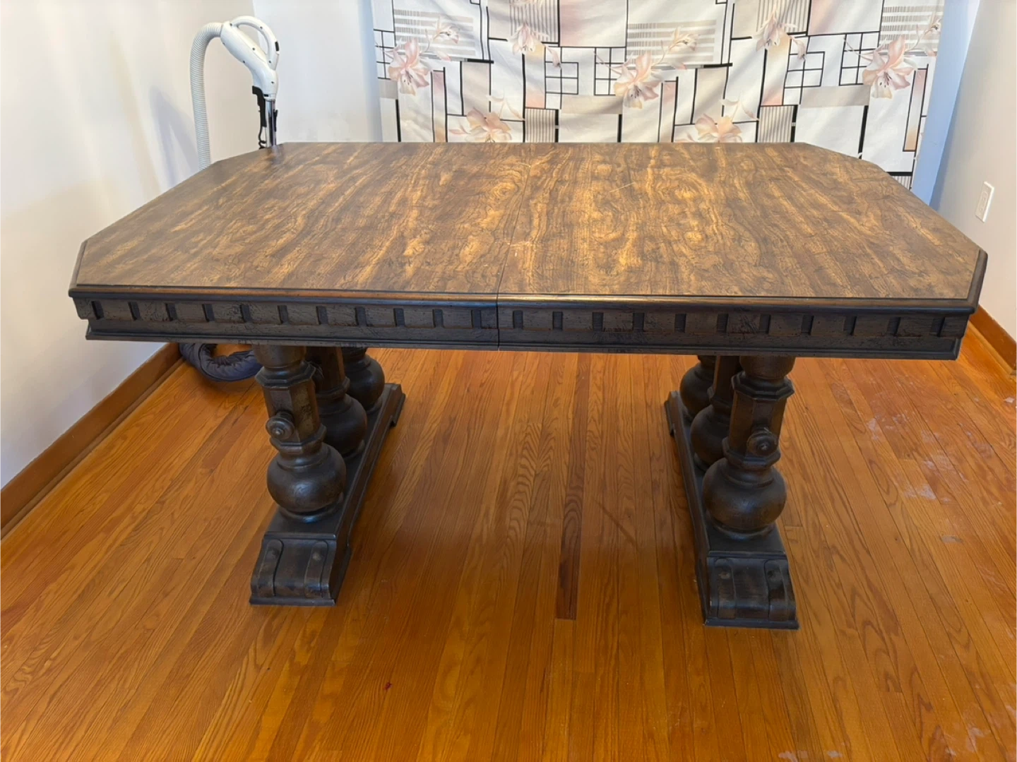 This vintage dark wood dining table extends to accommodate more guests. It features ornate carved pedestal legs for a classic look. Great for hosting family dinners or larger gatherings!
