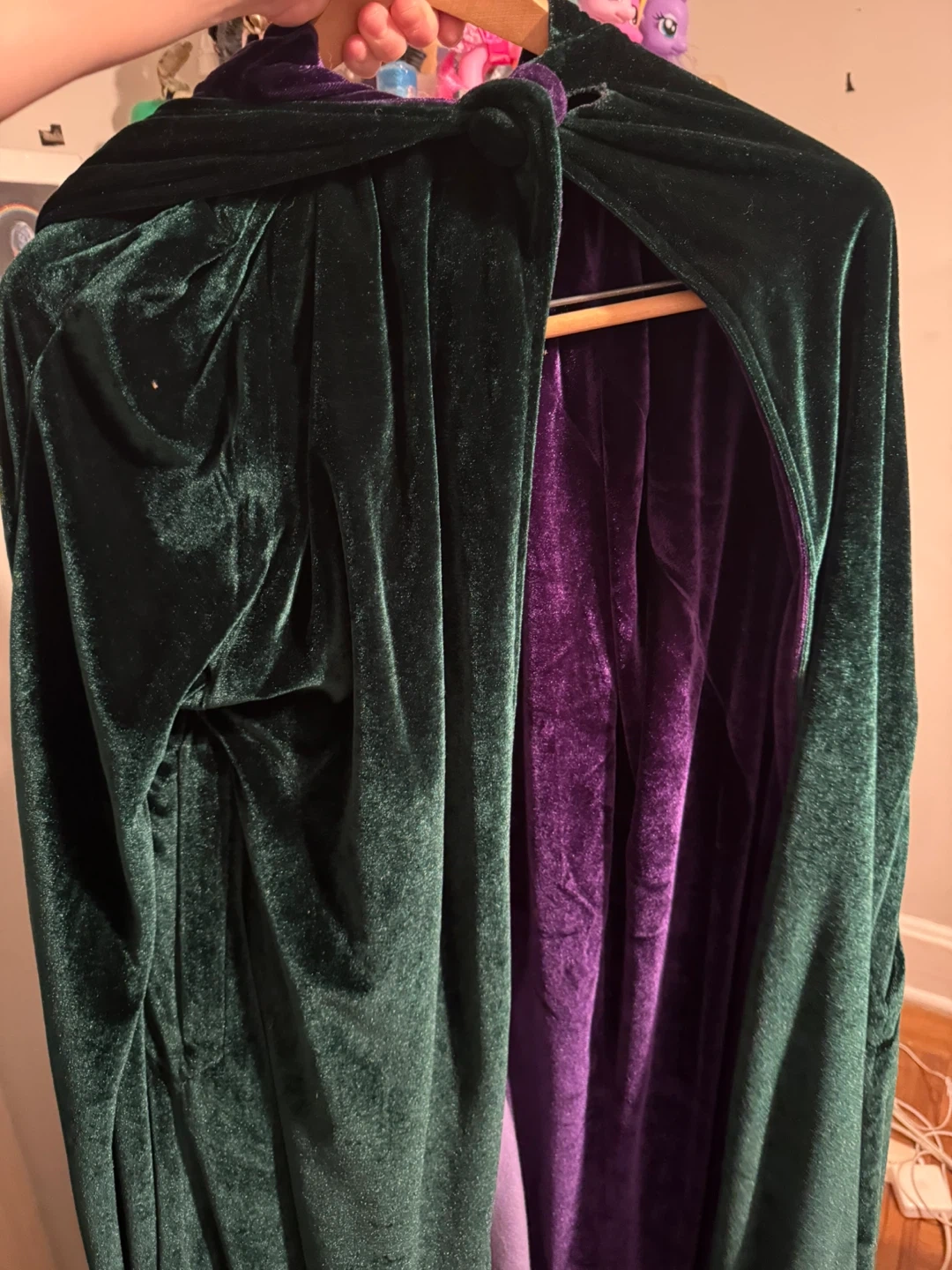 Selling a beautiful cloak! It's green on the outside and purple on the inside, made of soft velvet. It is very heavy though, please be aware