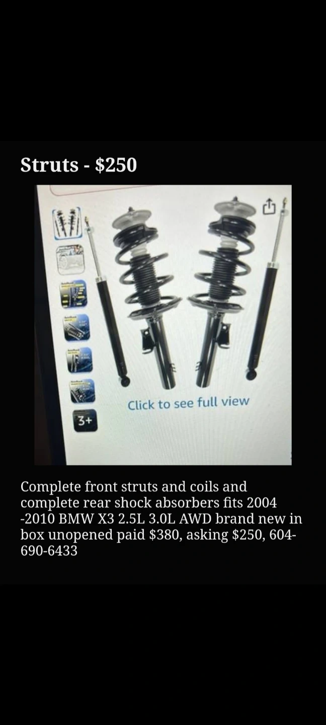 Complete front struts and coils, plus rear shock absorbers for 2004-2010 BMW X3 2.5L and 3.0L AWD models. Brand new in box, unopened. Paid $380.