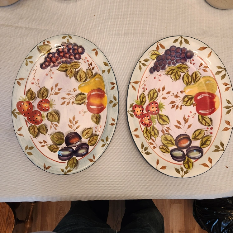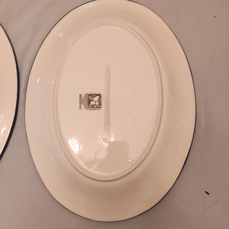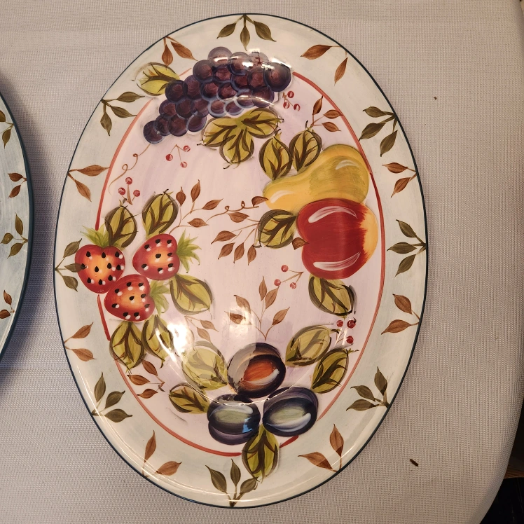 Beautiful set of two oval platters. Hand-painted fruit design. Dark blue rim. Excellent for serving. Part of the Black Forest Fuits collection by Heritage mint. no chips or damage.
