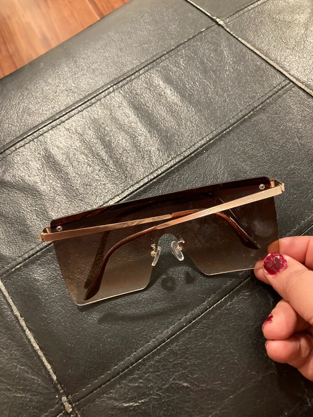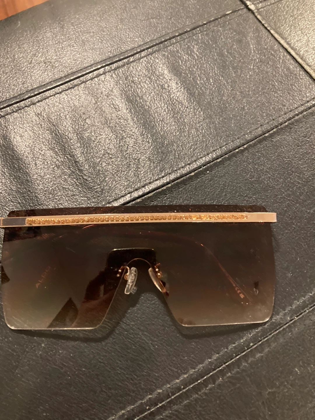 These stylish ALDO sunglasses feature a rose gold frame and gradient brown lenses. They're adorned with a band of sparkly rhinestones across the top. A great accessory for sunny days!