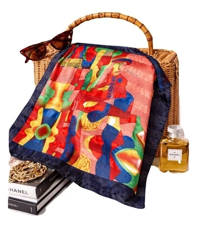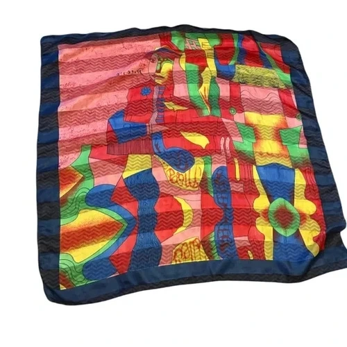 Vibrant silk scarf with abstract design. Features red, blue, green, and yellow colors. Material is satin-like and a bit sheer. No tags. Size: 37x36".