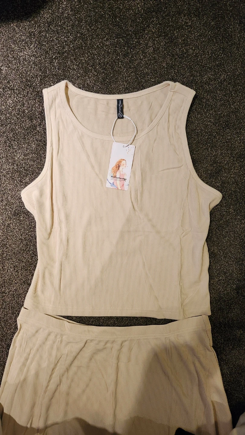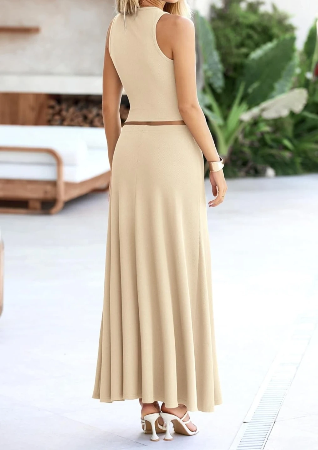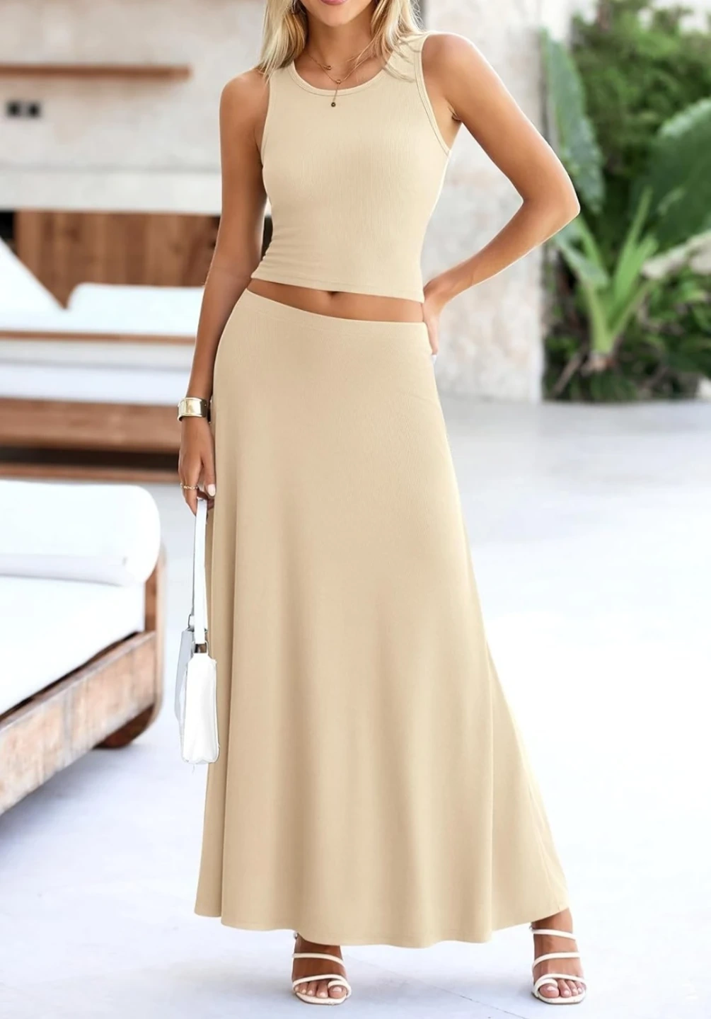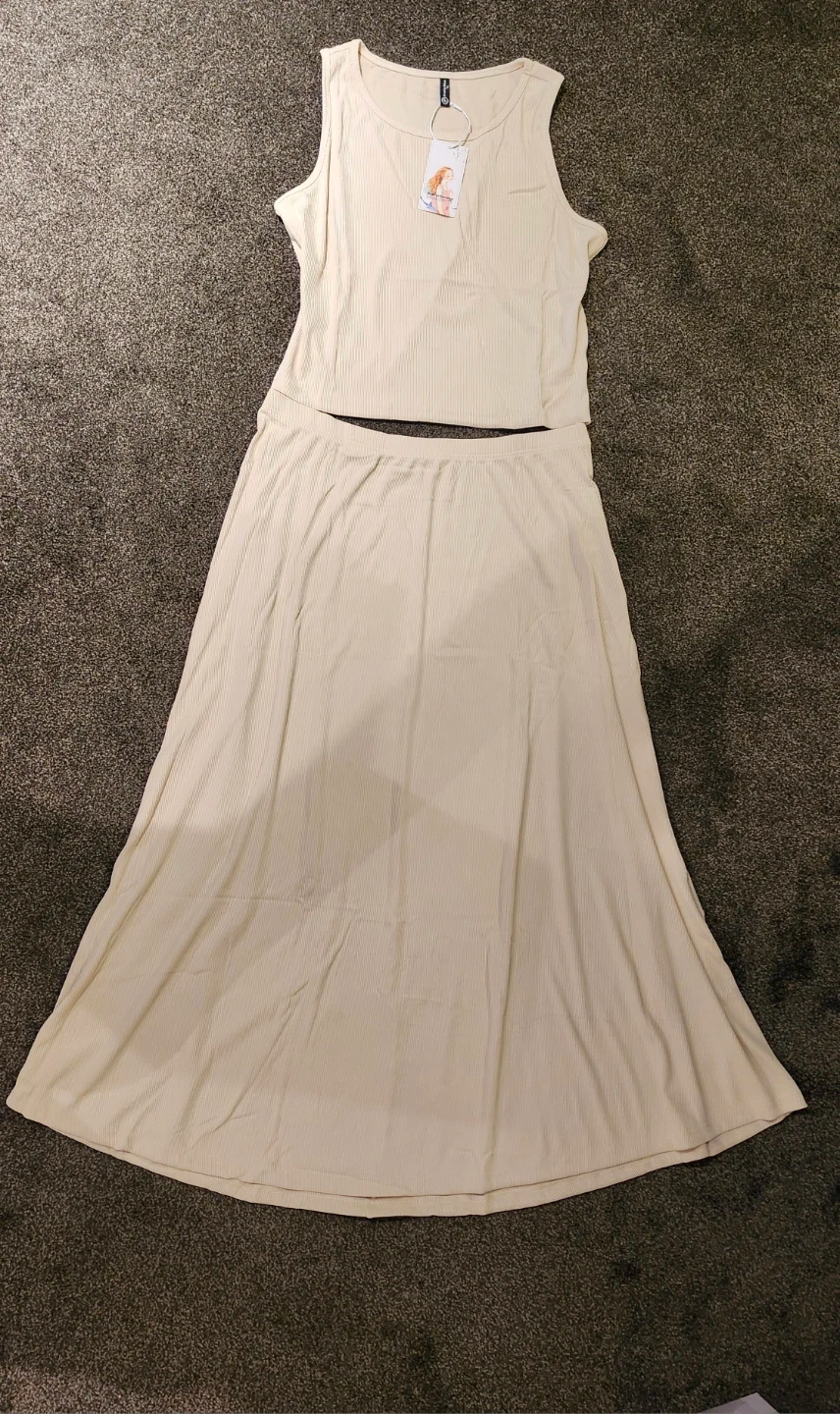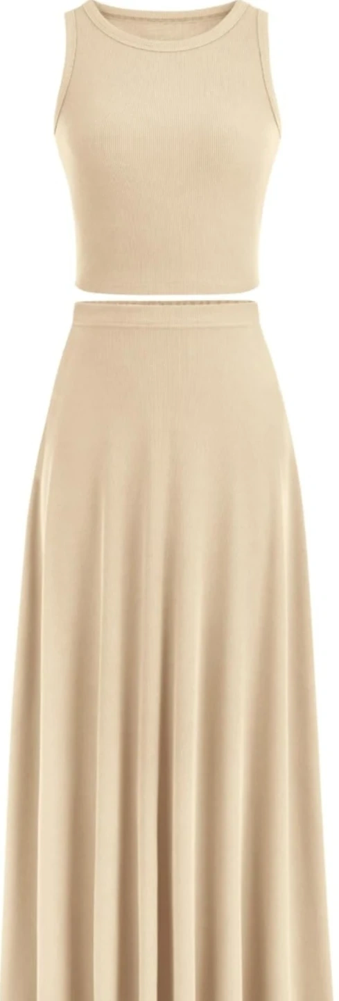 This matching set includes a ribbed tank top and a flowy maxi skirt. It's made from a comfortable, stretchy fabric. The outfit is great for casual wear or dressing up!