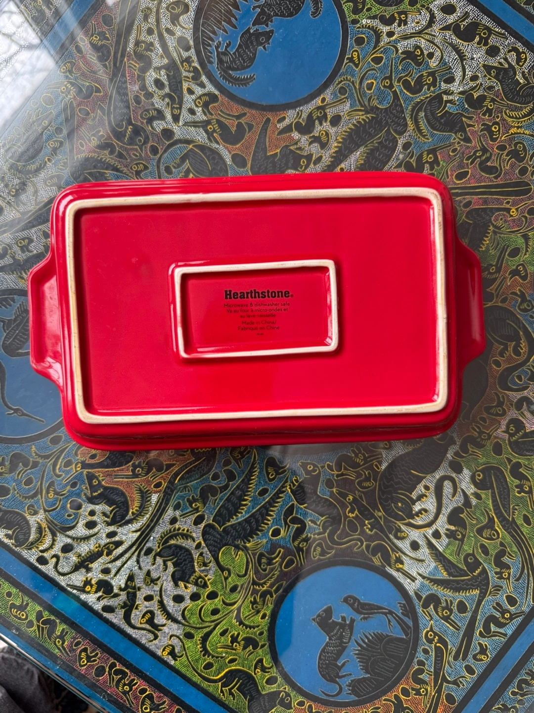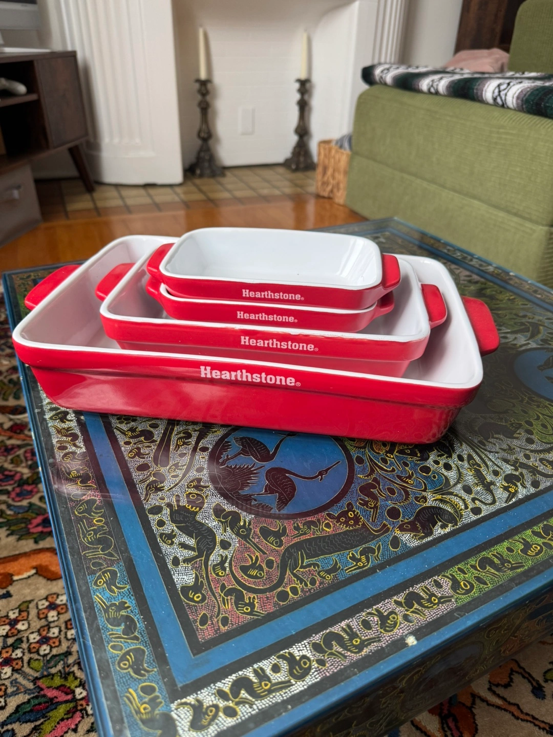 Set of four red ceramic baking dishes. Microwave and dishwasher safe. Various sizes. Only selling as set