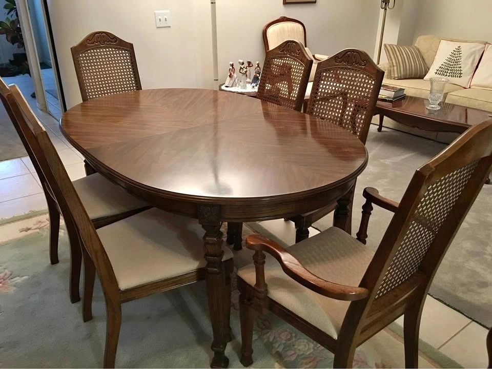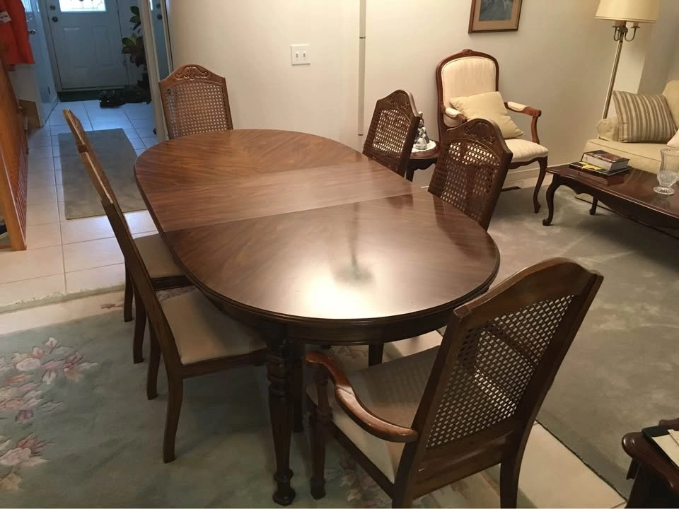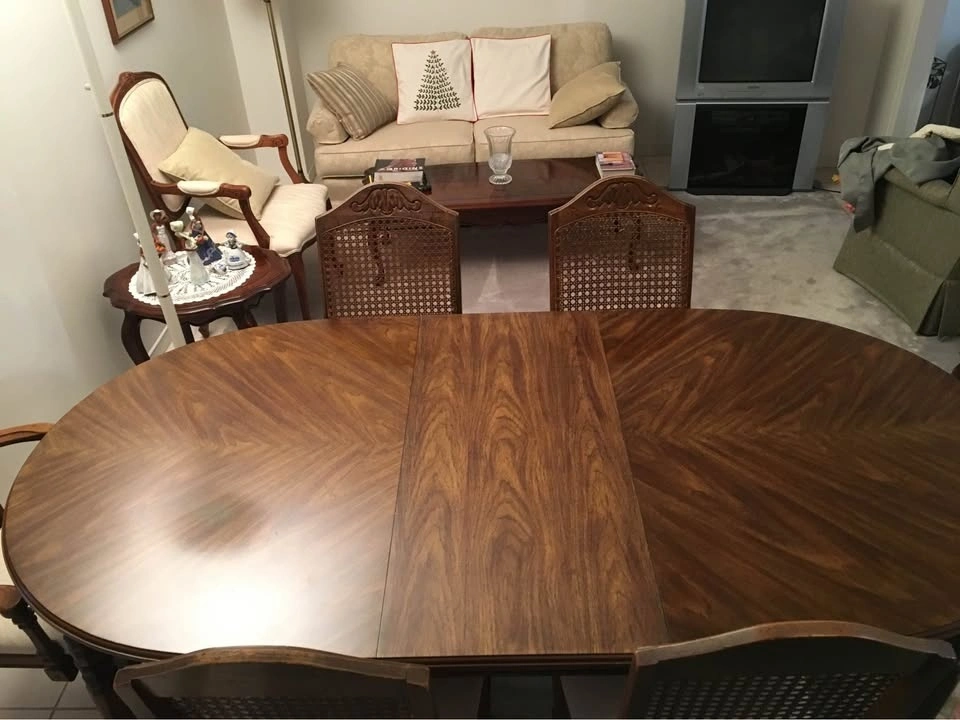 Vintage Pecan Dining Table & 5 Cane Back Chairs