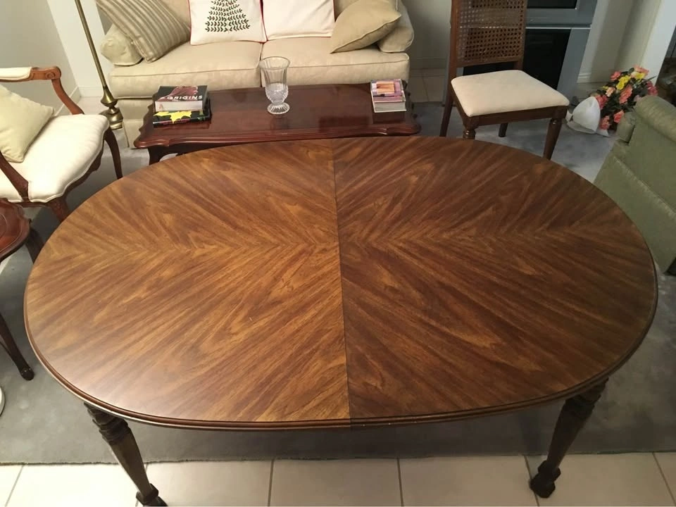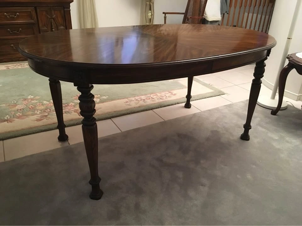 Colonial Revival Style. Purchased from the Art Shoppe in Toronto in 1973. The classic style of the oval, extendable dining table with simple, carved legs provides a traditional look. The dining table is in excellent condition and includes a centre piece extension. Some scratches on the perimeter that can be touched up easily.