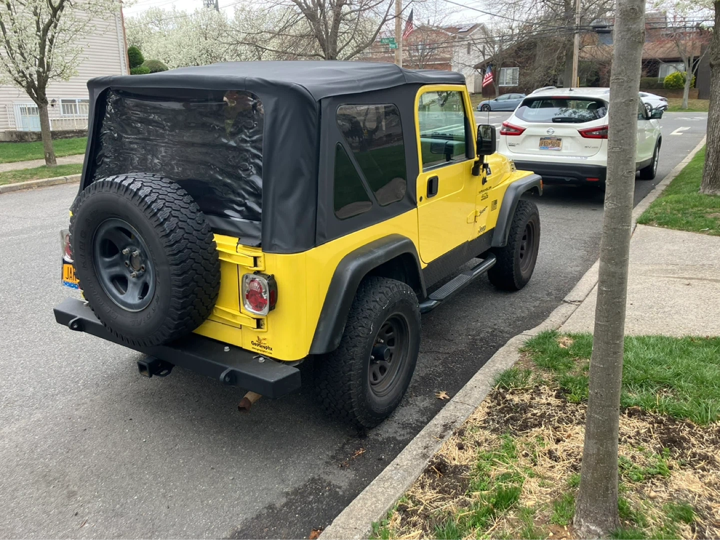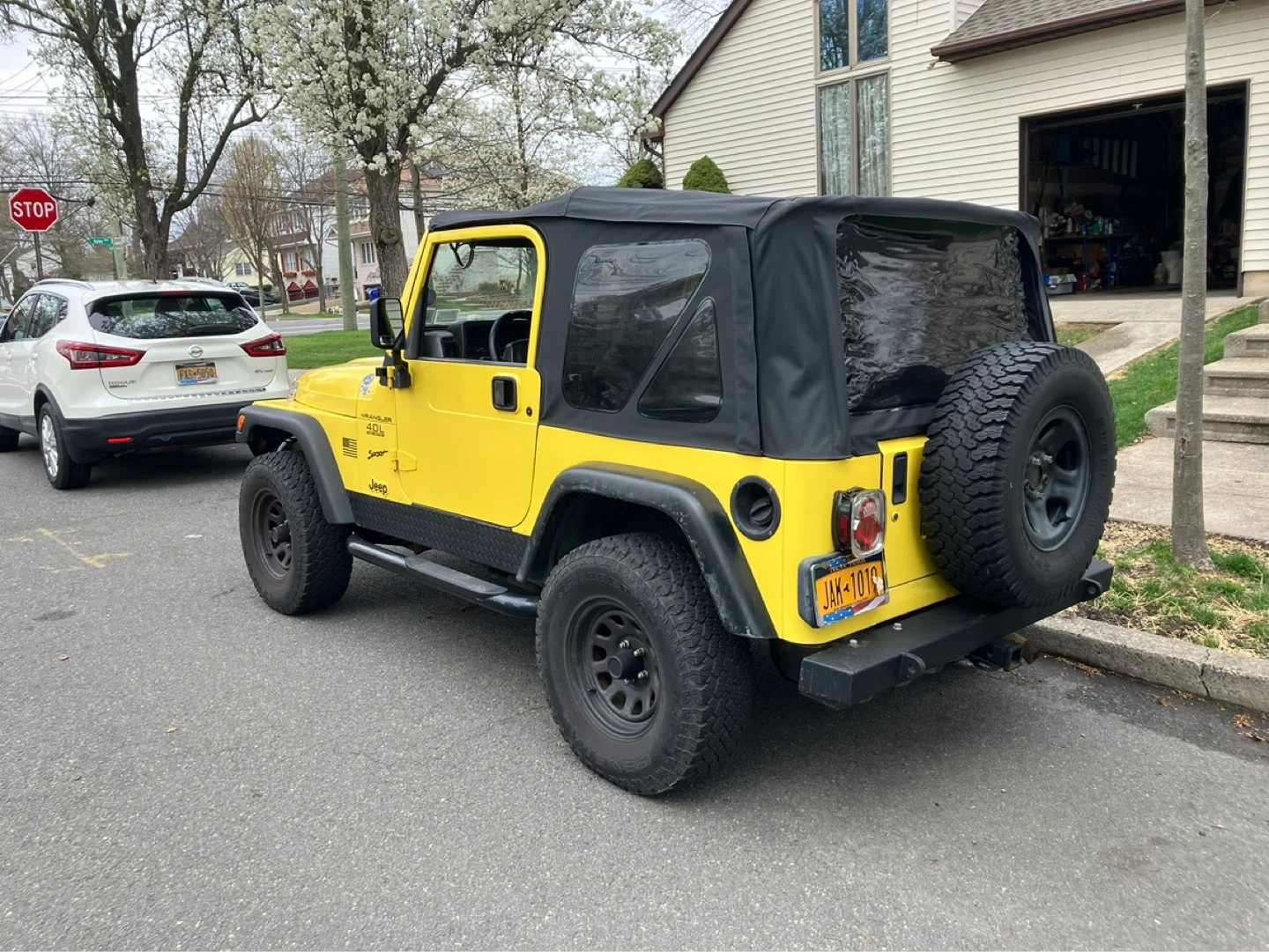 This is a yellow Jeep Wrangler Sport with the 4.0L engine. It features a black soft top and tinted rear windows. The vehicle has a spare tire mounted on the back. Great for off-road adventures!