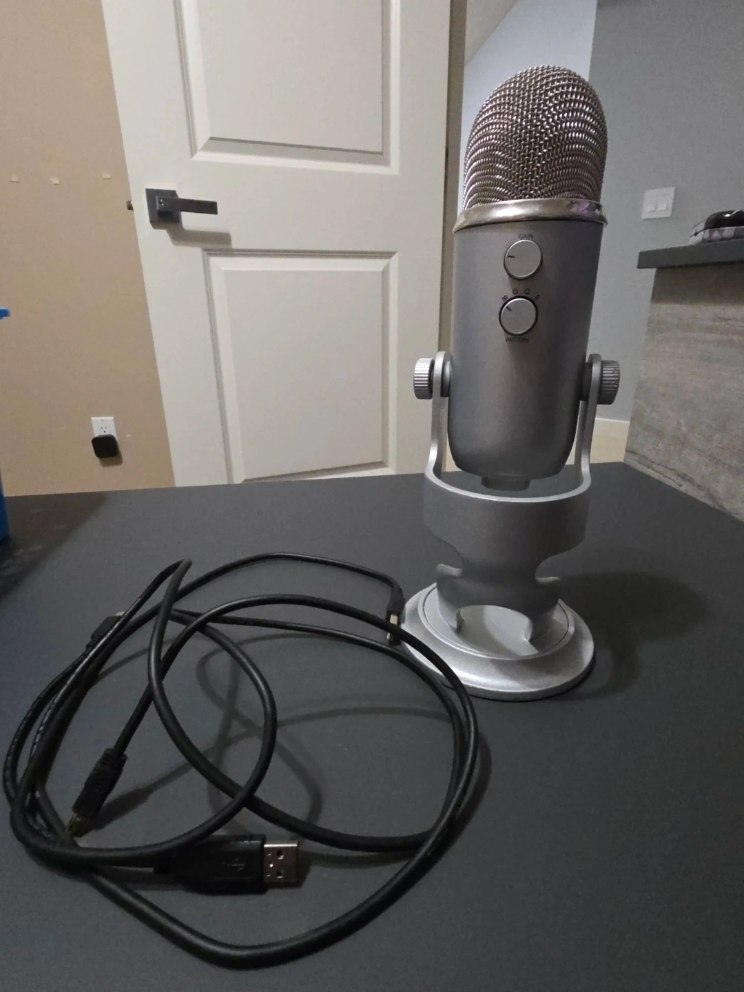 This is a Blue Yeti USB microphone in silver. It comes with a USB cable for easy plug-and-play connectivity. This mic is great for streaming, podcasting, or recording voiceovers.