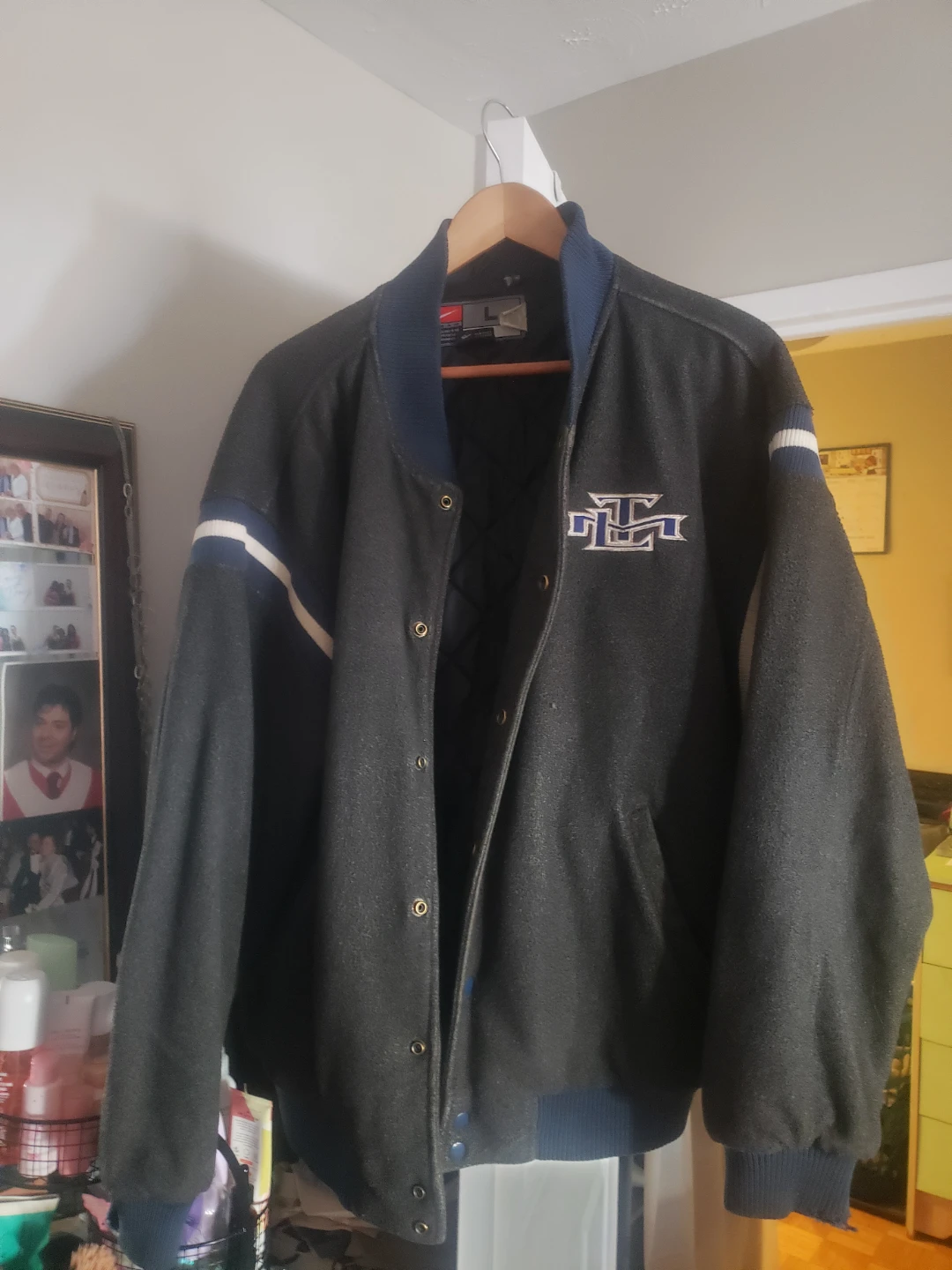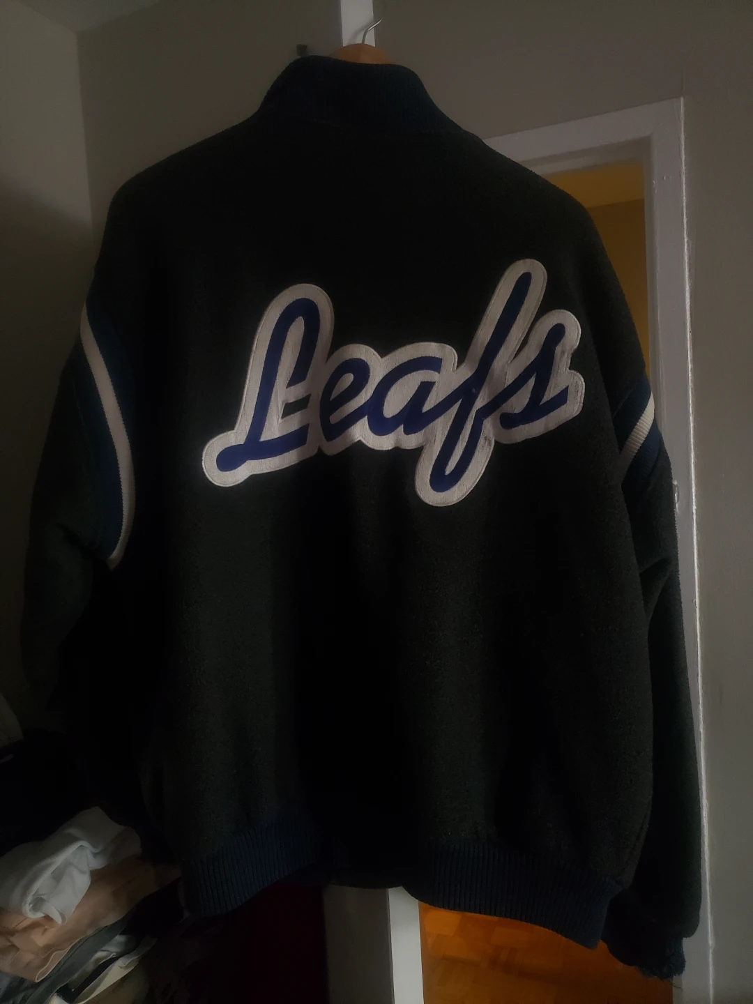 Selling a Toronto Maple Leafs jacket in a wool blend material. It features the Leafs logo on the back and a smaller logo on the front. Great for any Leafs fan!