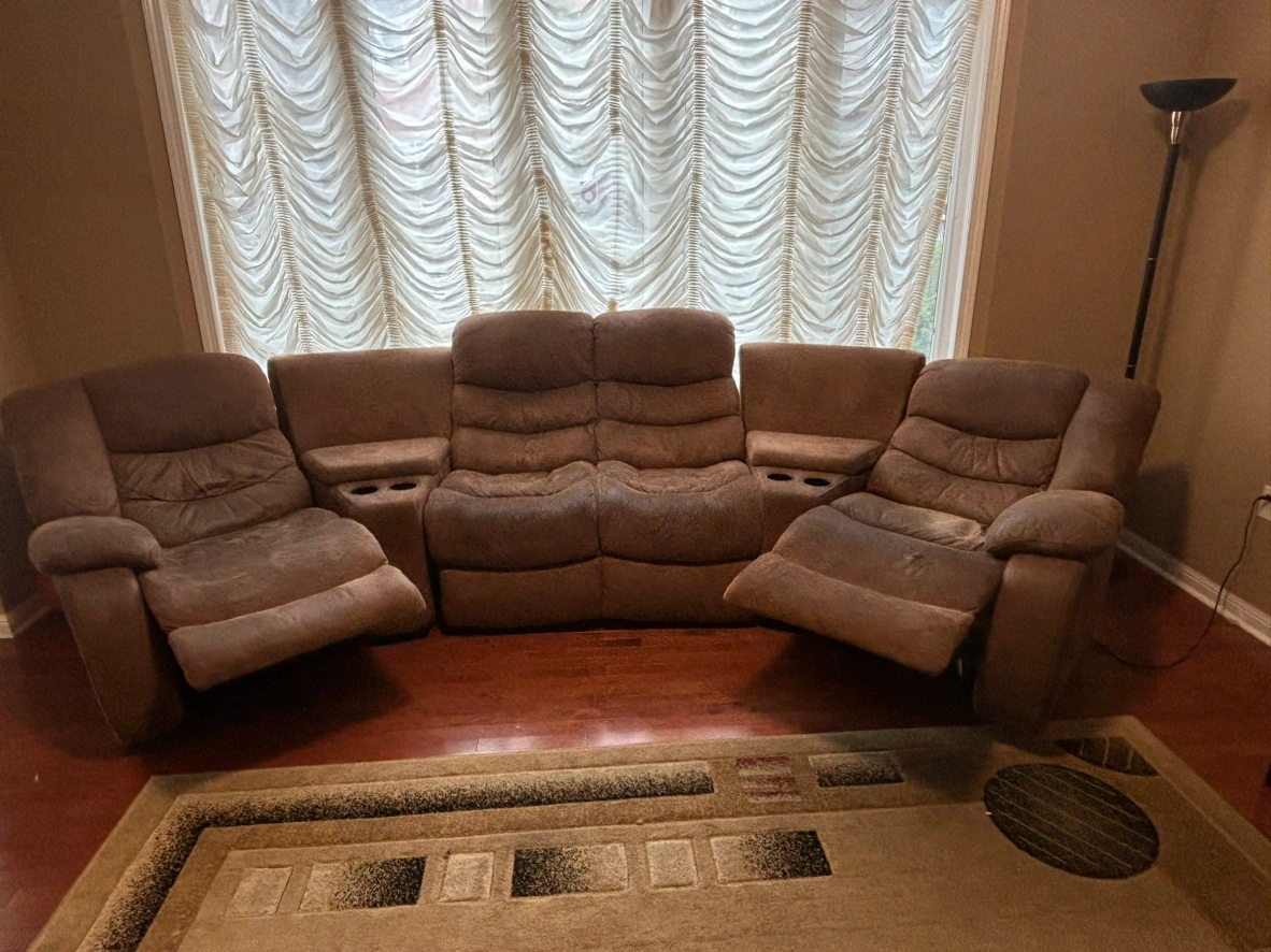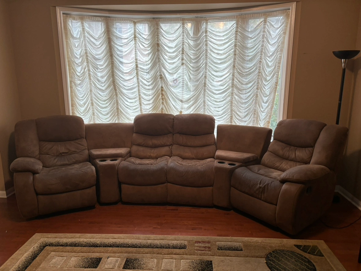 This is a beautiful and comfortable sectional recliner sofa with built in cupholders. The sofa is in good condition and is perfect for any living room. It is made of a soft, durable fabric and has a comfortable, supportive seat. The sofa comes with three recliners. It is easy to assemble and comes with all the necessary hardware. The sofa is available for pickup only.