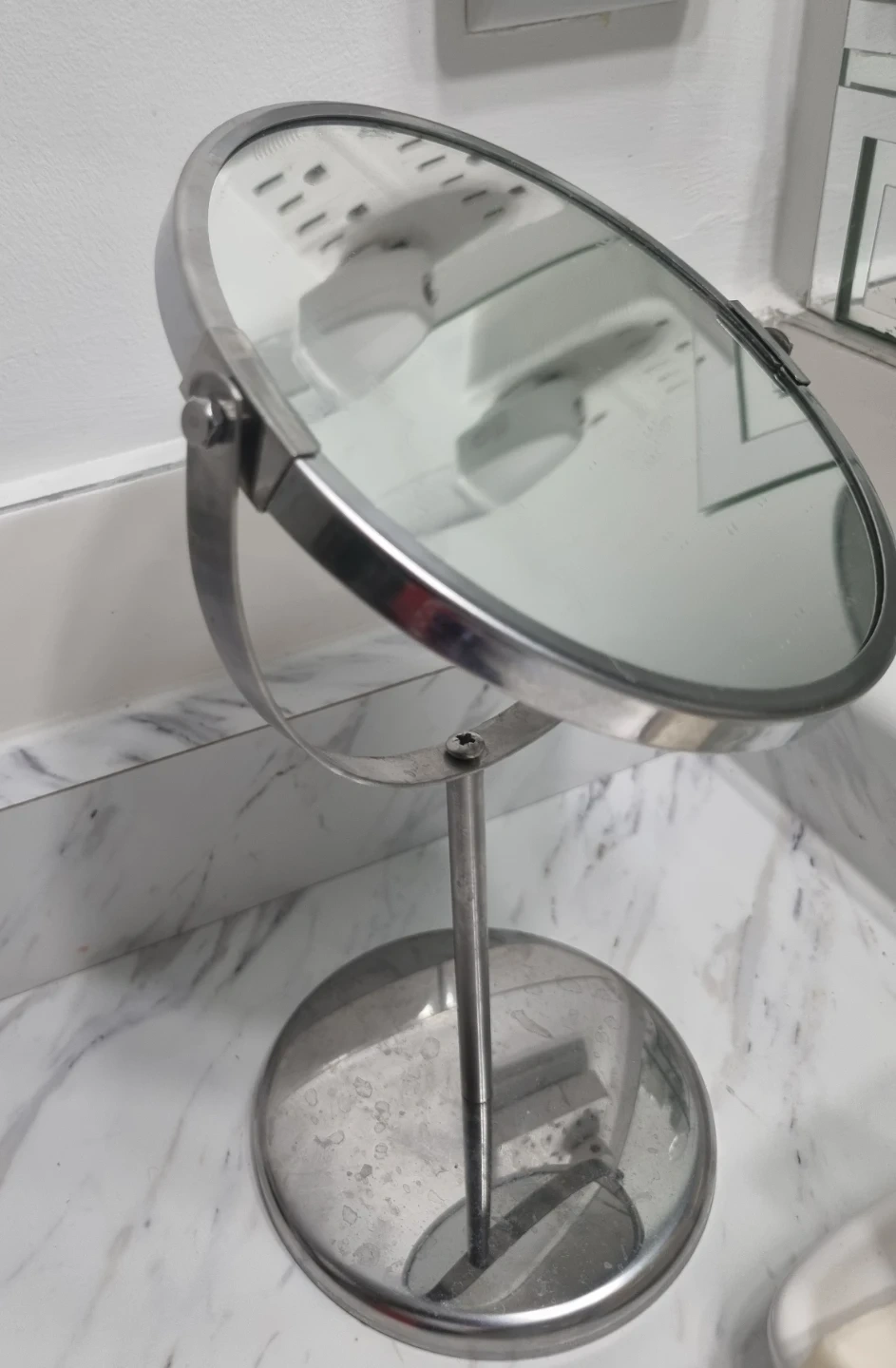 A stainless steel tabletop vanity mirror. It's a double-sided mirror with a circular base. This mirror is great for makeup application or other grooming needs.🥕🥕🥕