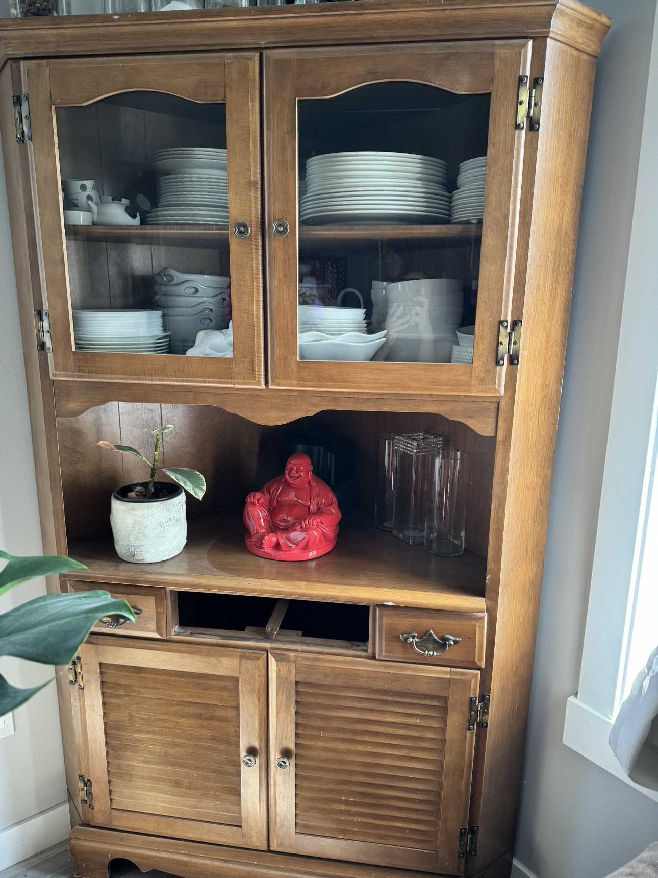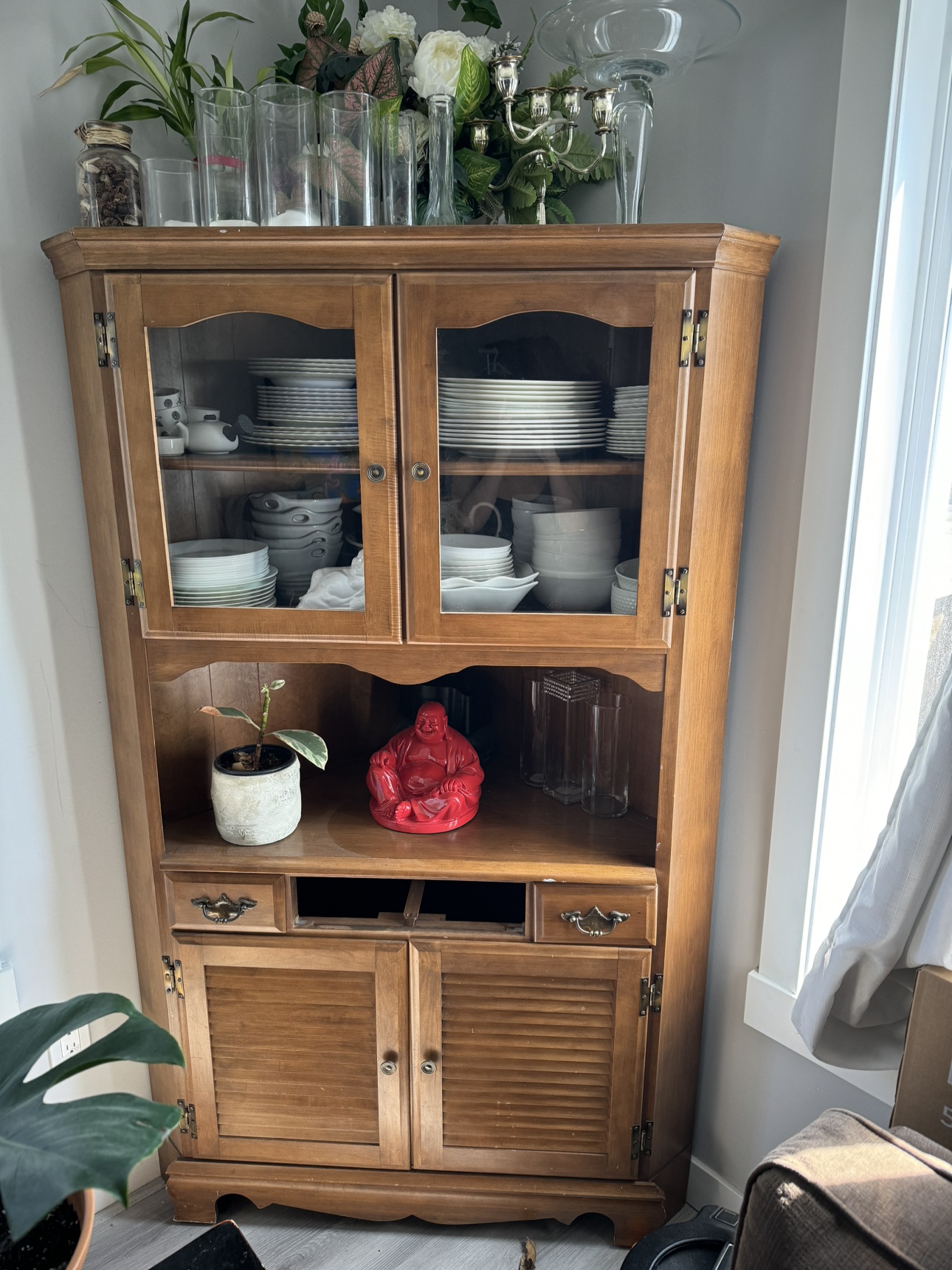 A corner cabinet with glass doors and a drawer. It has two shelves in the upper section. There are two wooden doors on the bottom. The doors on the bottom have slatted designs. Missing drawer in the middle