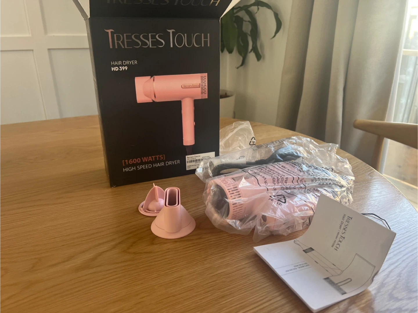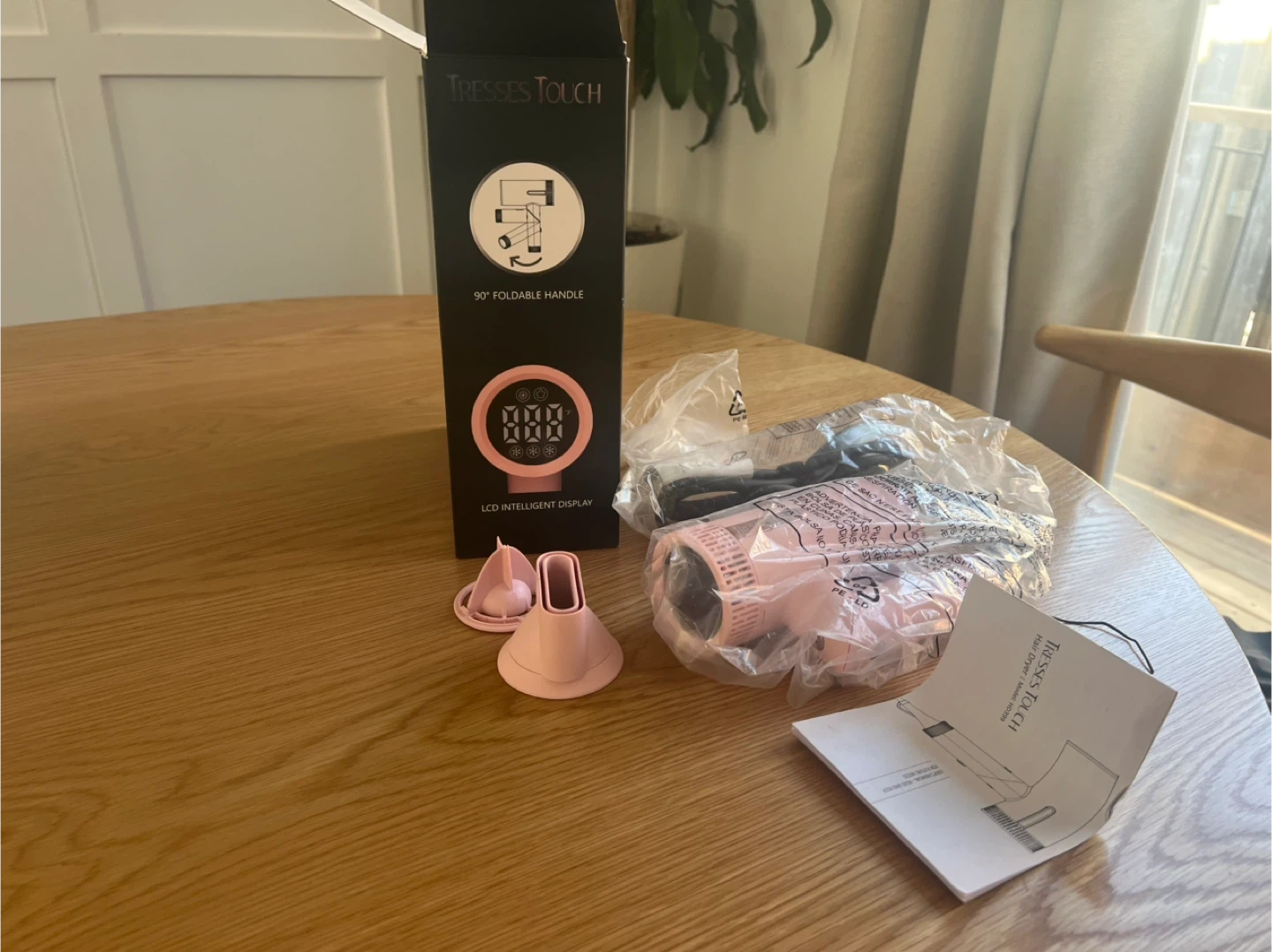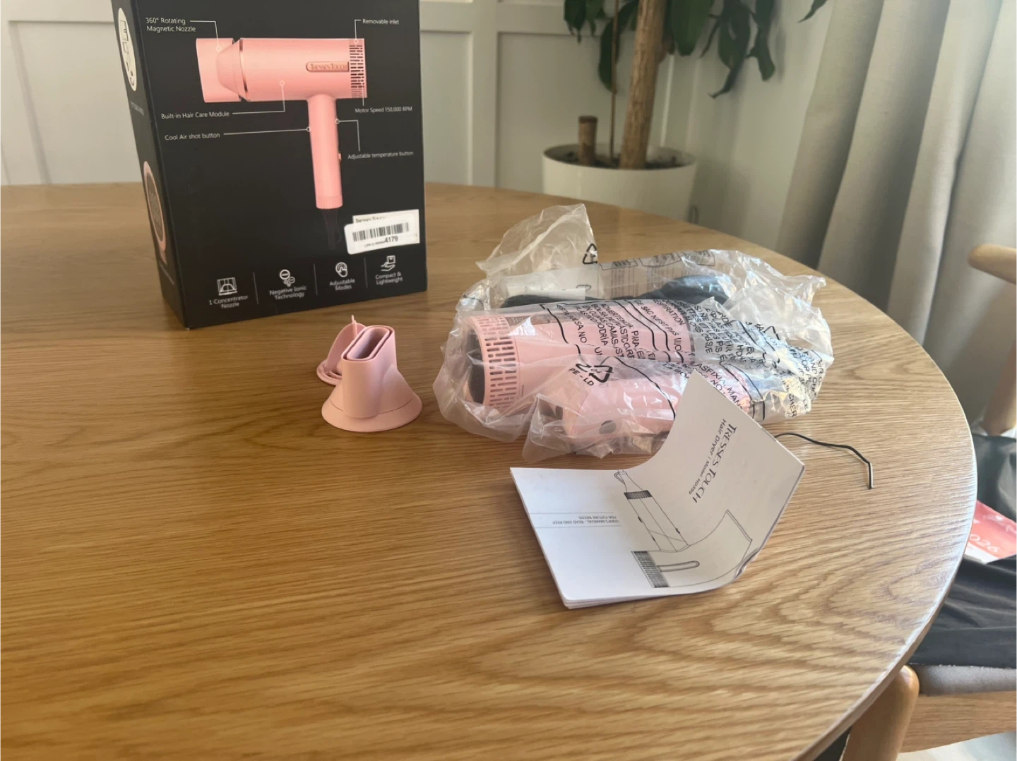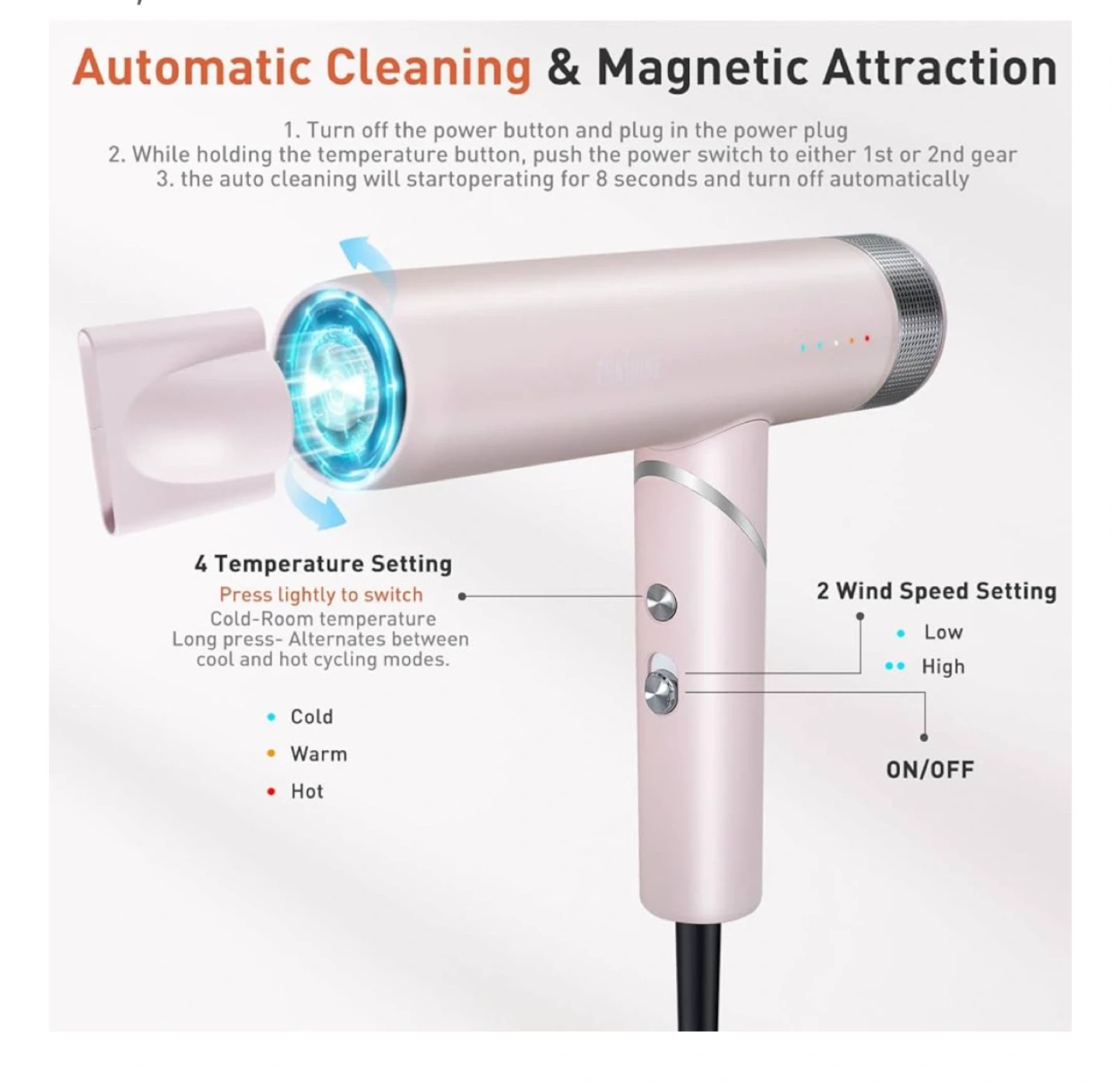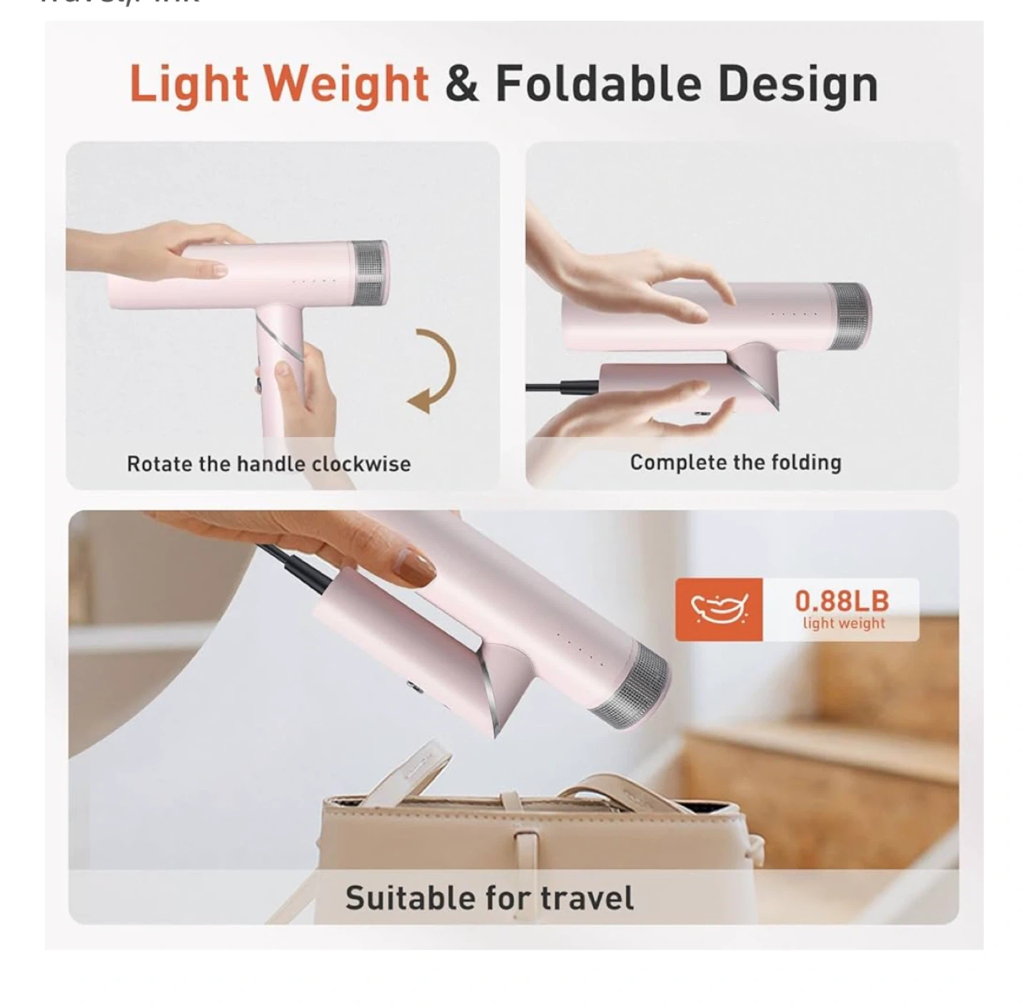 This pink hair dryer offers 110,000 RPM for faster drying with a powerful wind speed of 25M/S. It's lightweight at 0.88LB and features a foldable design, making it suitable for travel. The dryer operates at a low noise level, under 70 dB, and has 4 temperature settings and 2 wind speed settings.