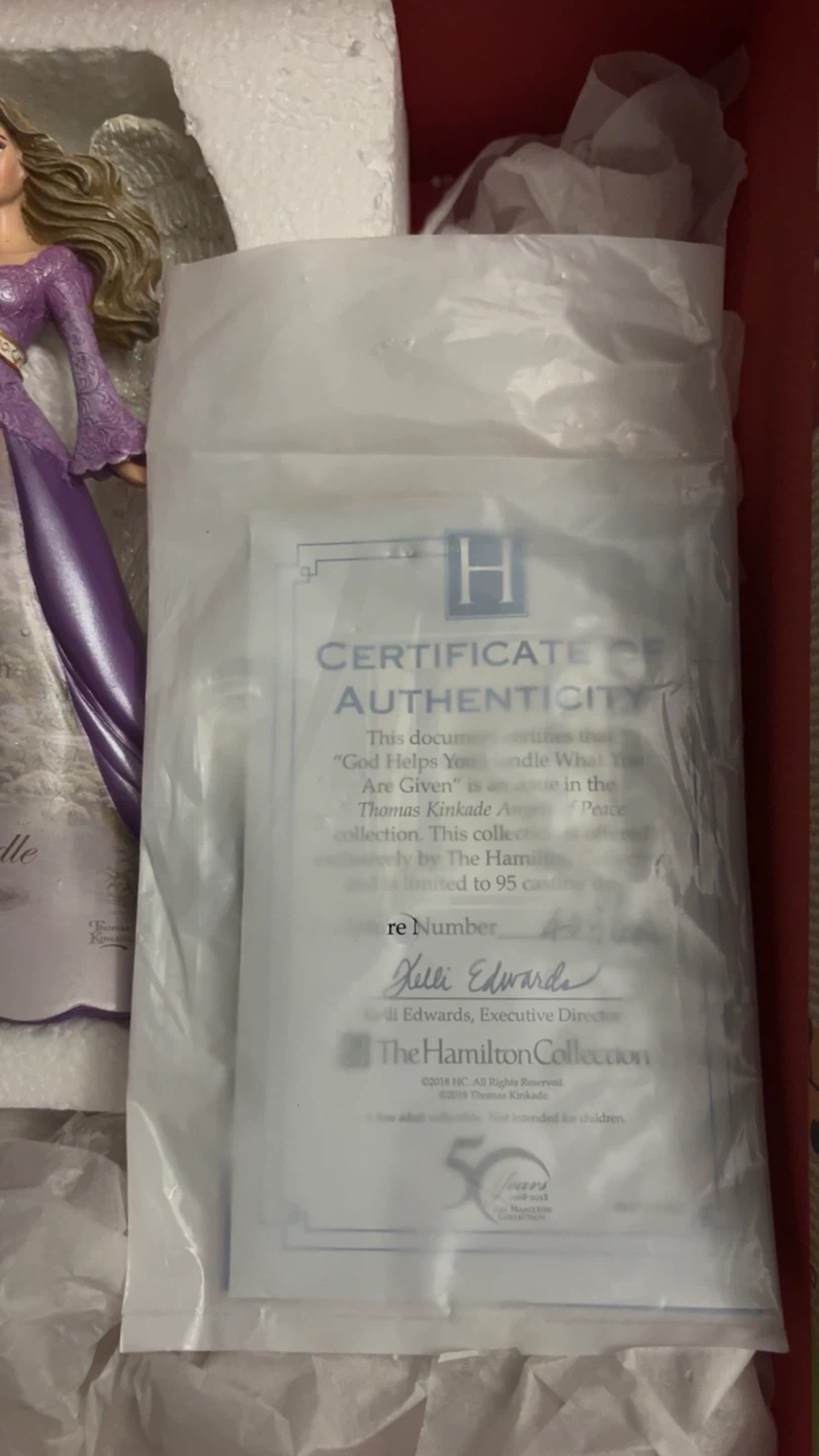 This is a beautiful Thomas Kinkade angel figurine from The Hamilton Collection. The dress features the quote "God does not give you what you can handle. God helps you handle what you are given". It comes with a certificate of authenticity.