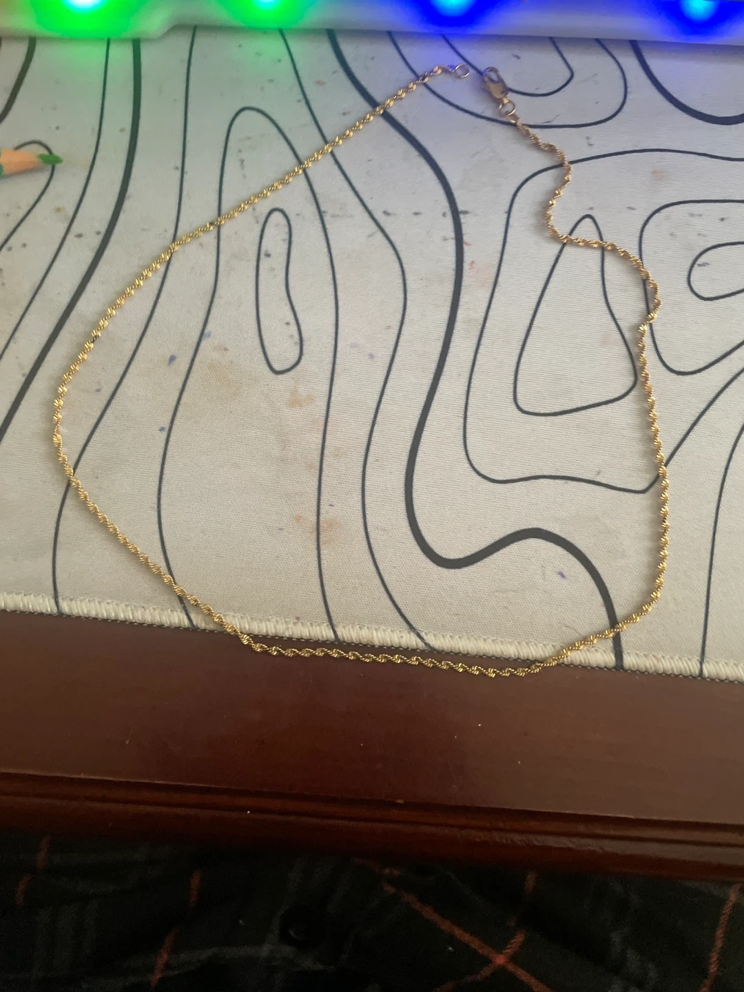 A classic gold-toned rope chain necklace. It's approximately 18 inches long. This necklace has a lobster clasp closure. It's suitable for everyday wear or layering with other pieces.