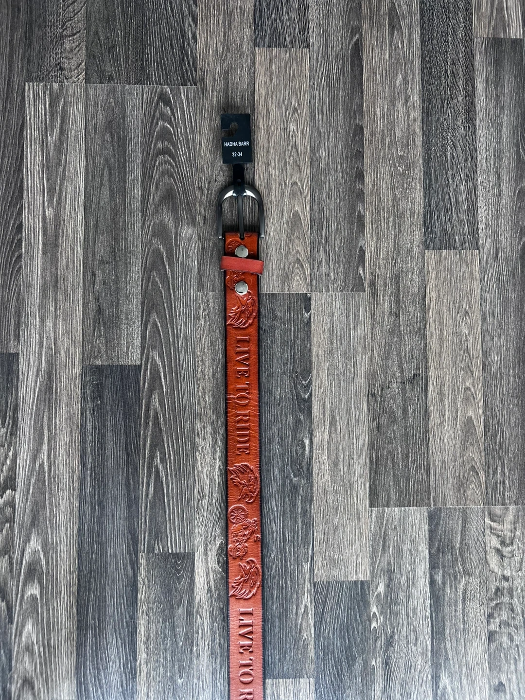 This is a Hadha Barr full grain leather belt. It's a size 32-34 with a "Live to Ride" embossed design. The material is 100% full grain leather.
