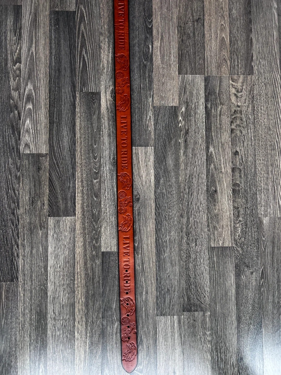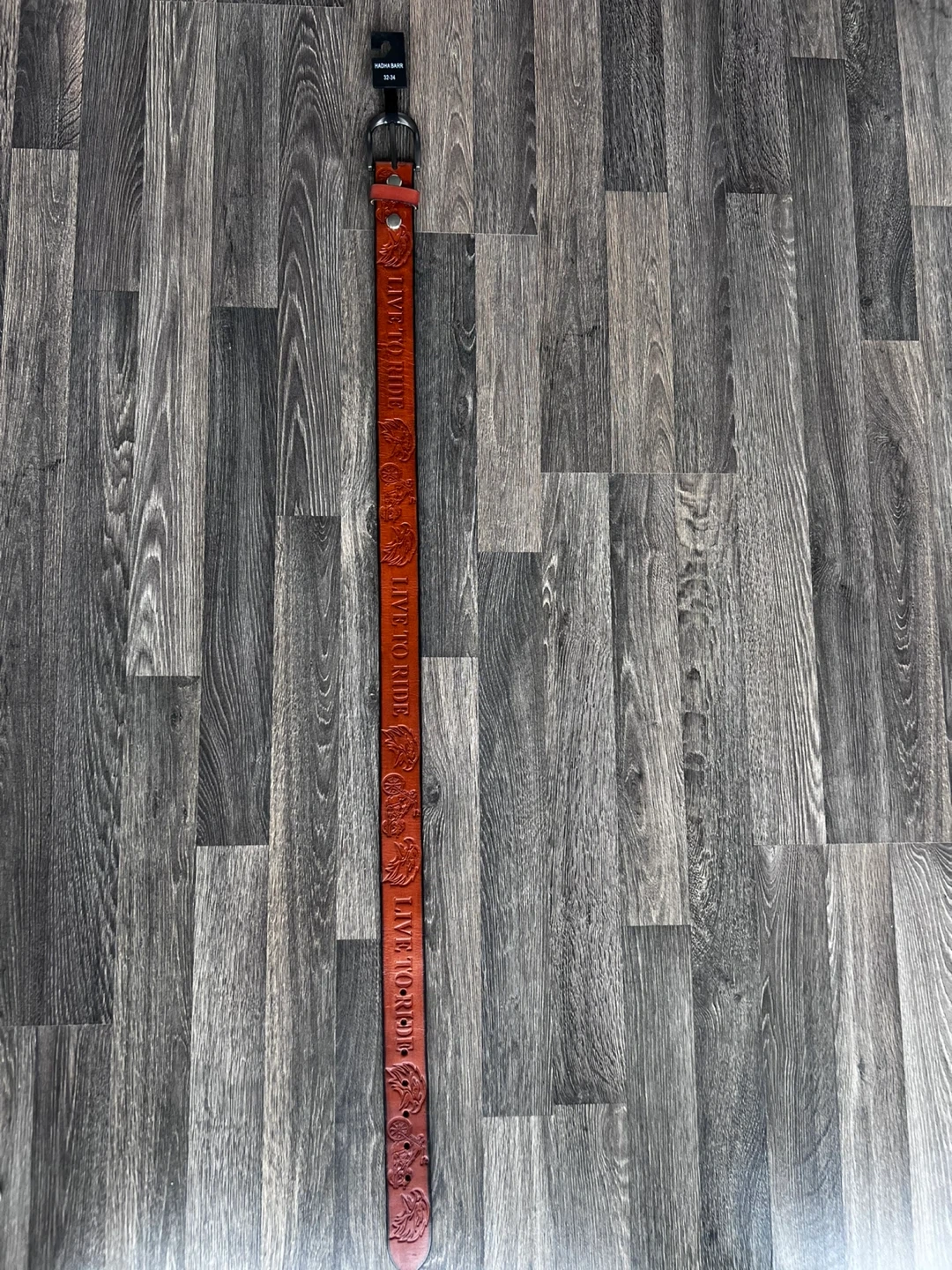 This is a Hadha Barr full grain leather belt. It's a size 32-34 with a "Live to Ride" embossed design. The material is 100% full grain leather.