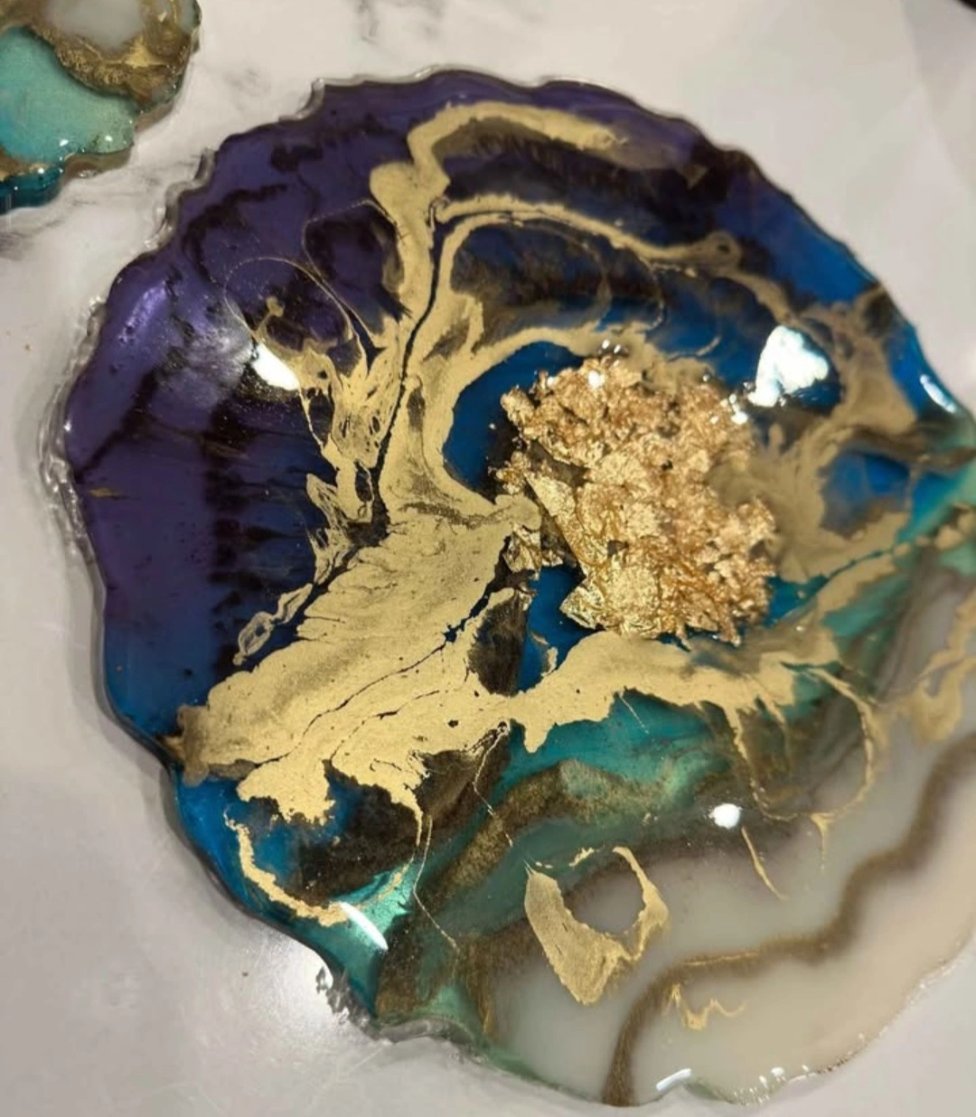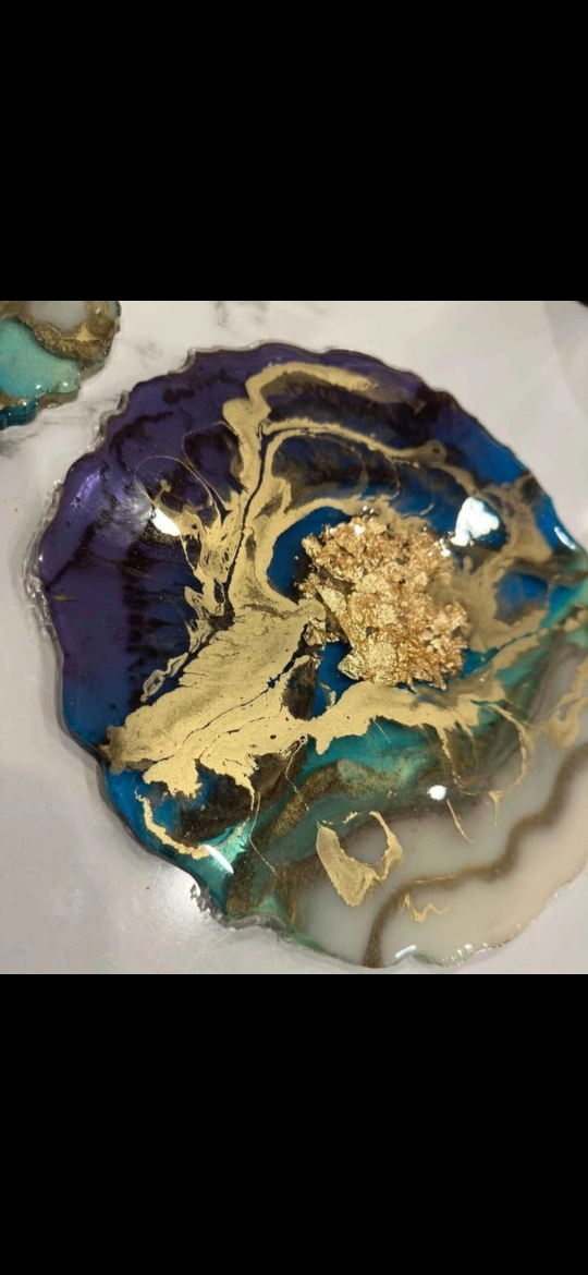 Add a touch of elegance to your home with these unique handmade resin coasters! coaster features beautiful swirls of blue, purple, and teal, accented with shimmering gold flakes. Perfect for protecting your furniture while adding a decorative touch to any room