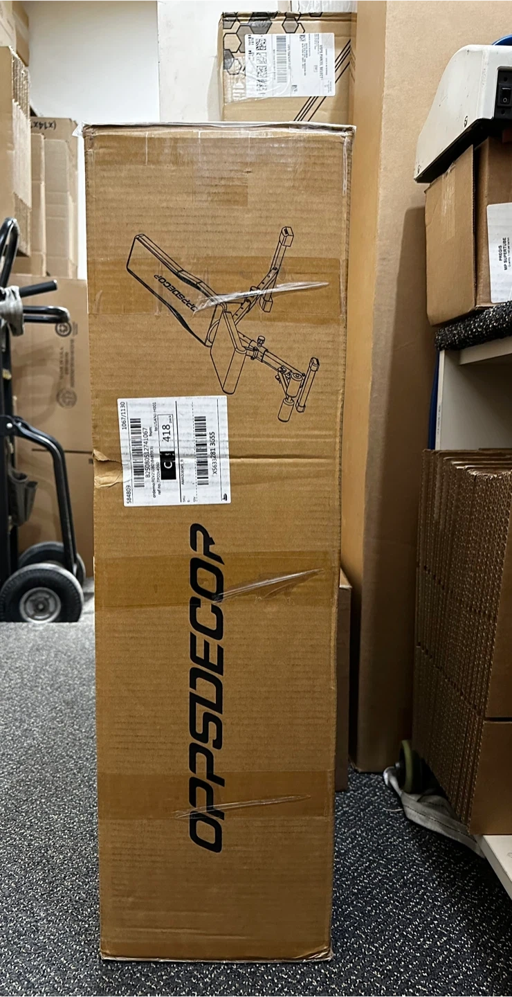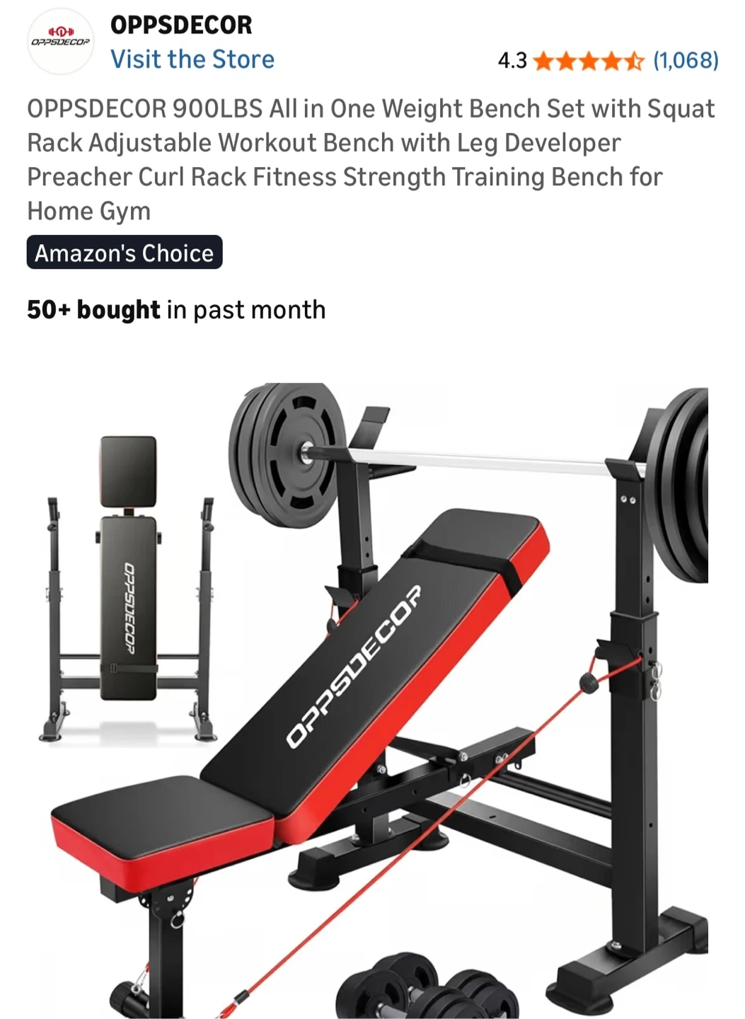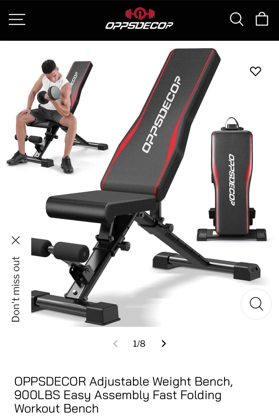 This is an OPPSDECOR adjustable weight bench. It's designed for fast folding and easy carrying. The bench is 90% assembled and comes with removable safety J-pins and a lift strap handle. It measures 0.75ft² when folded.