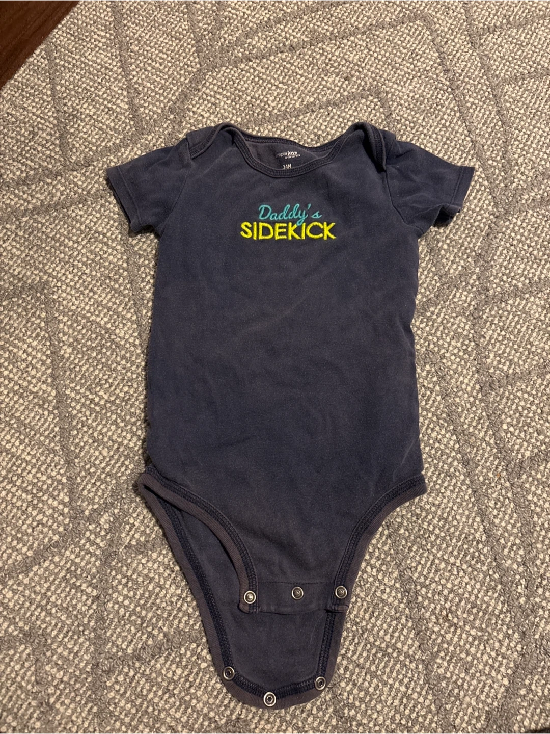 This is a navy blue baby onesie with "Daddy's Sidekick" embroidered on the front. It's a size 24 months. Made from soft cotton for comfort. Perfect for little ones to wear around the house or for special occasions with dad!